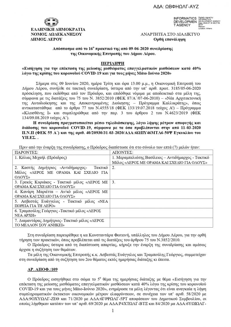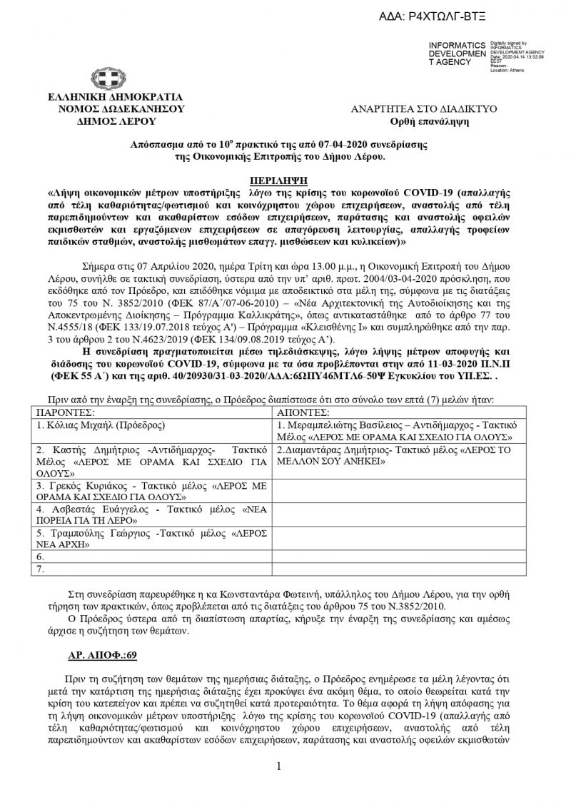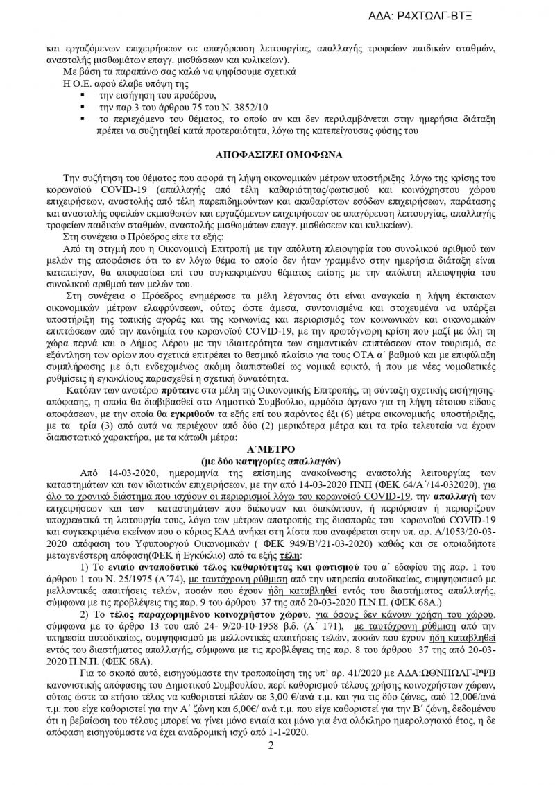 1) «Λήψη οικονομικών μέτρων υποστήριξης λόγω της κρίσης του κορωνοϊού COVID-19 (απαλλαγής από τέλη καθαριότητας/φωτισμού και κοινόχρηστου χώρου επιχειρήσεων, αναστολής από τέλη παρεπιδημούντων και ακαθαρίστων εσόδων επιχειρήσεων, παράτασης και αναστολής οφειλών εκμισθωτών και εργαζόμενων επιχειρήσεων σε απαγόρευση λειτουργίας, απαλλαγής τροφείων παιδικών σταθμών, αναστολής μισθωμάτων επαγγ. μισθώσεων και κυλικείων)»