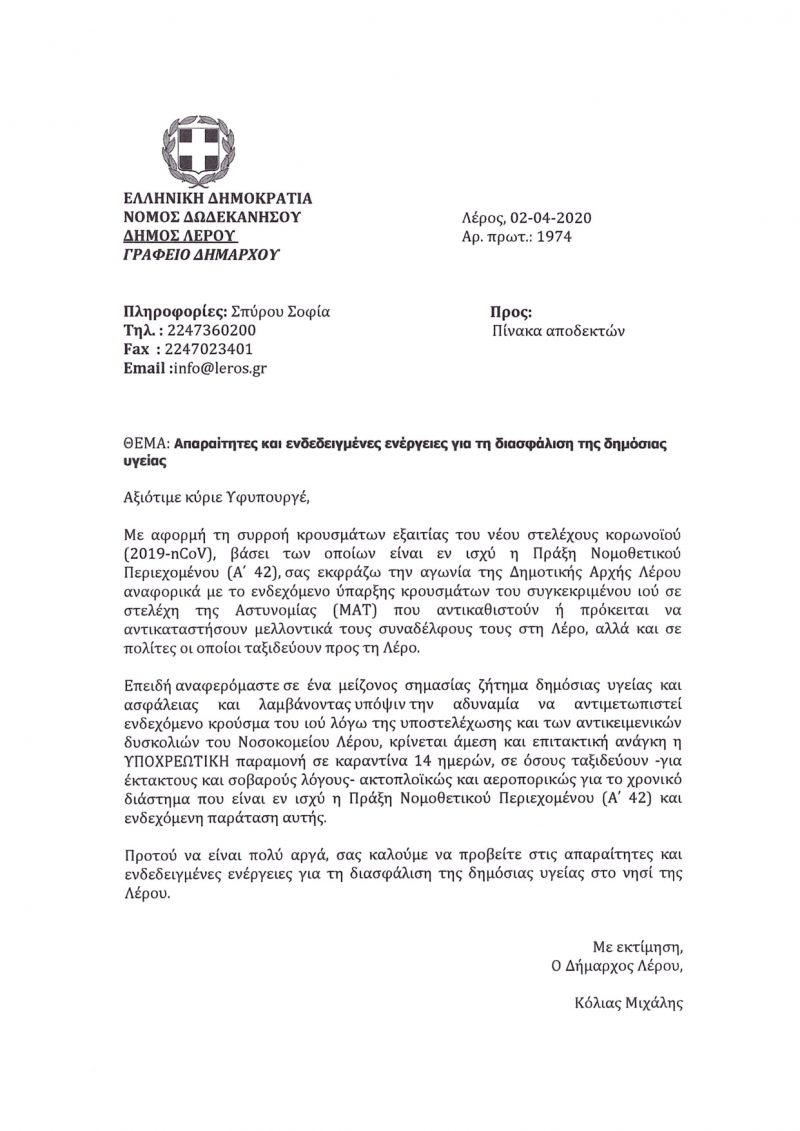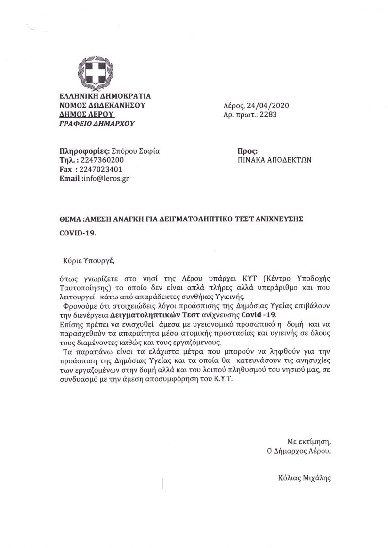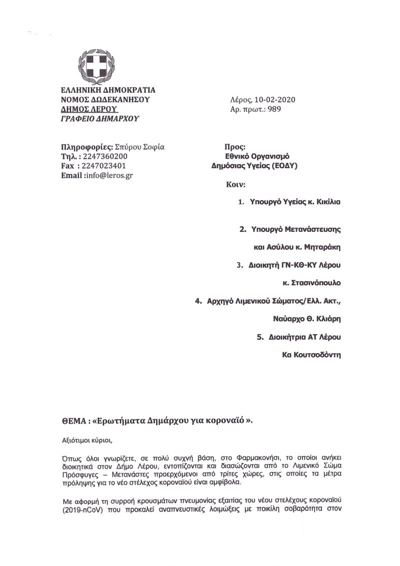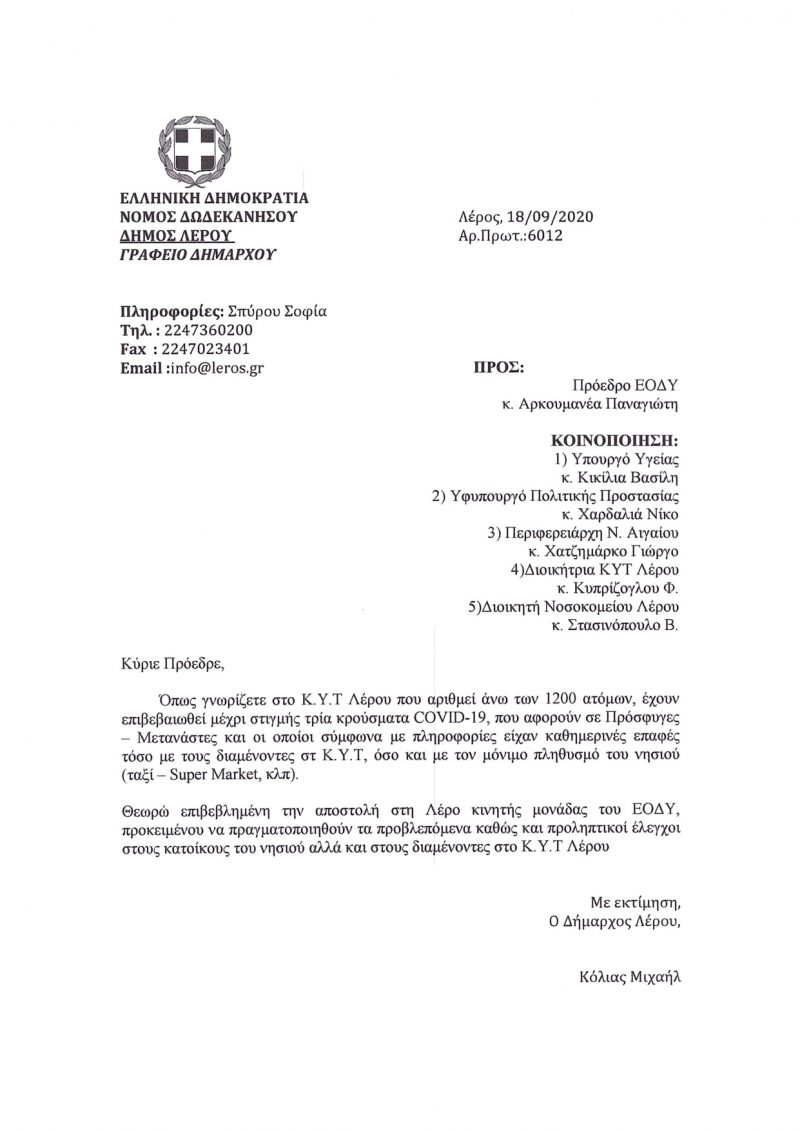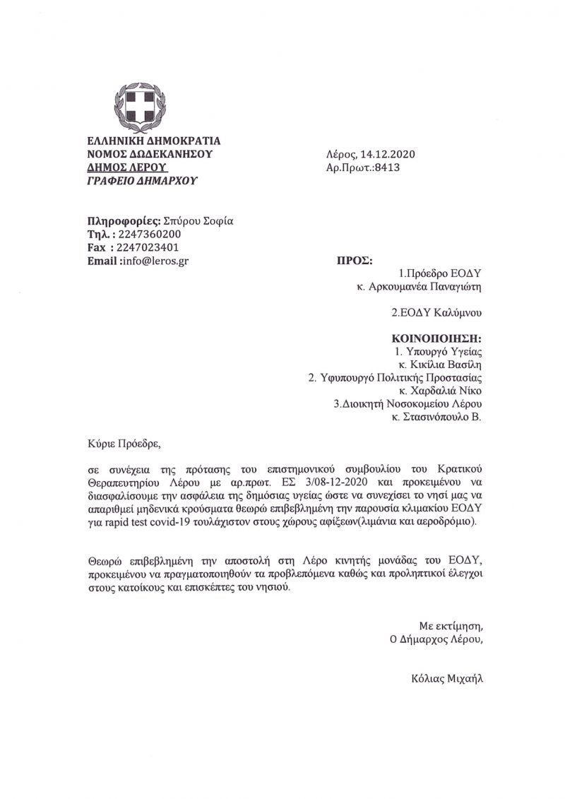 Την ευθύνη διαχείρισης της πανδημίας στο νησί μας την έχει ο Δήμος, αλλά κυρίως ο ΕΟΔΥ, το Κ.Υ Λέρου και η διοίκηση του.
