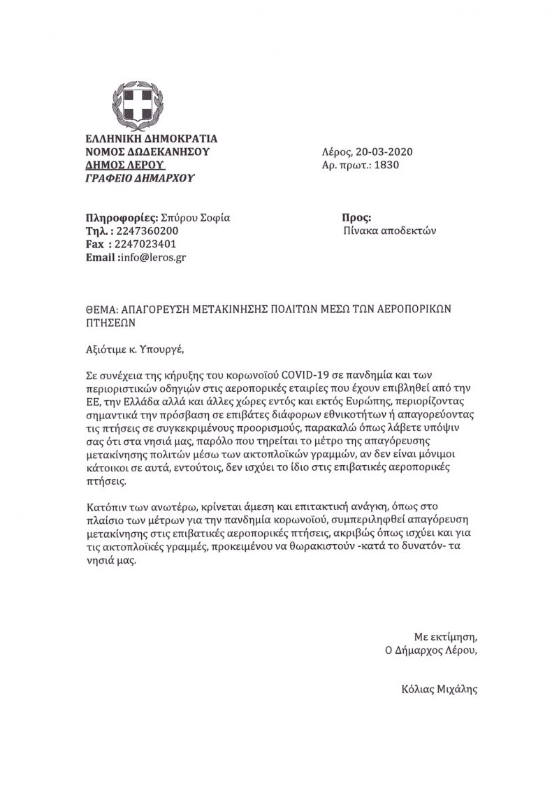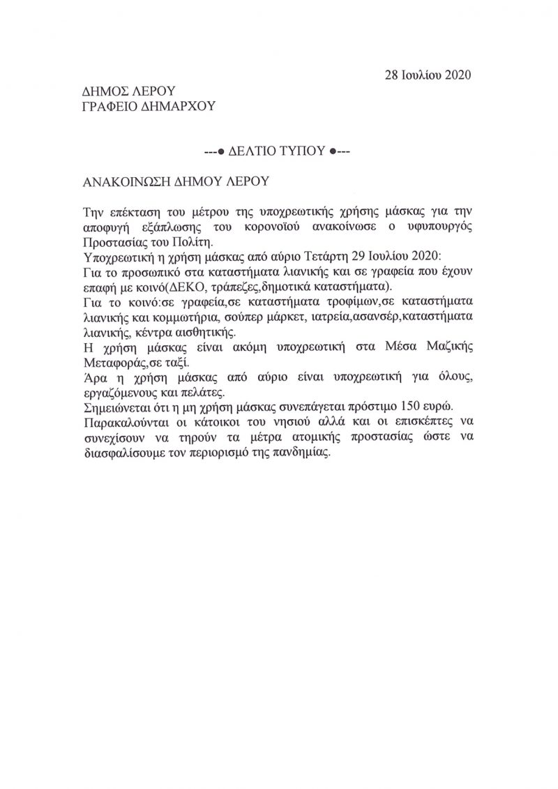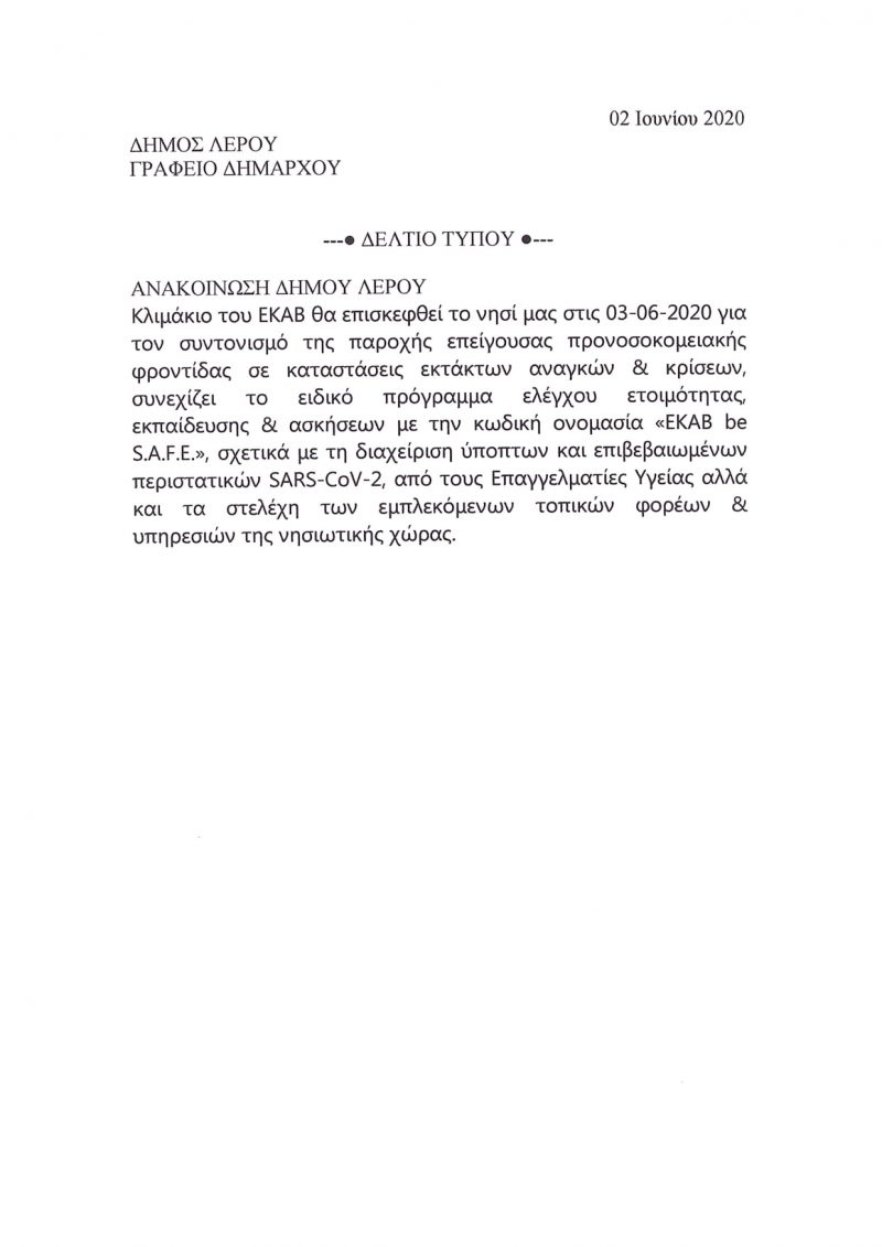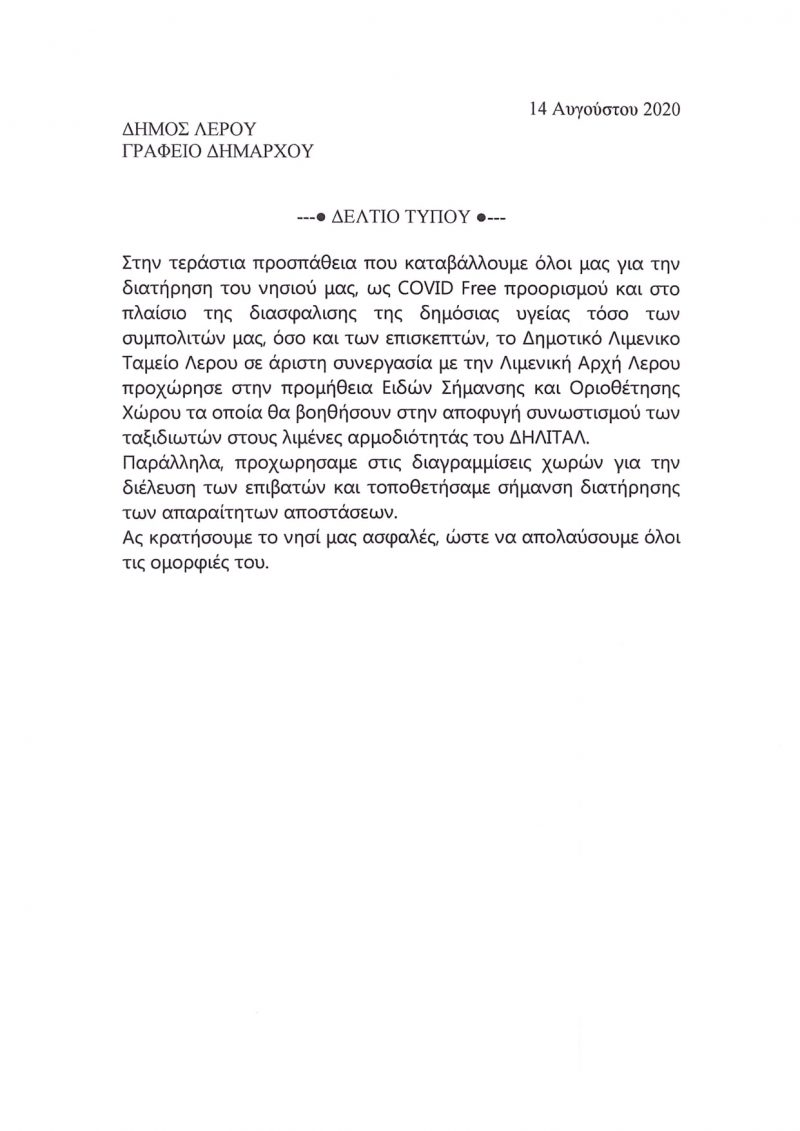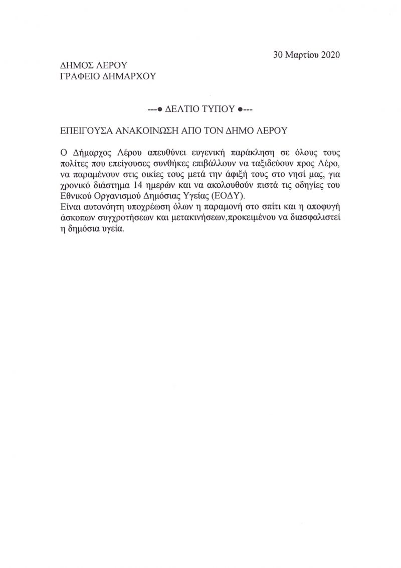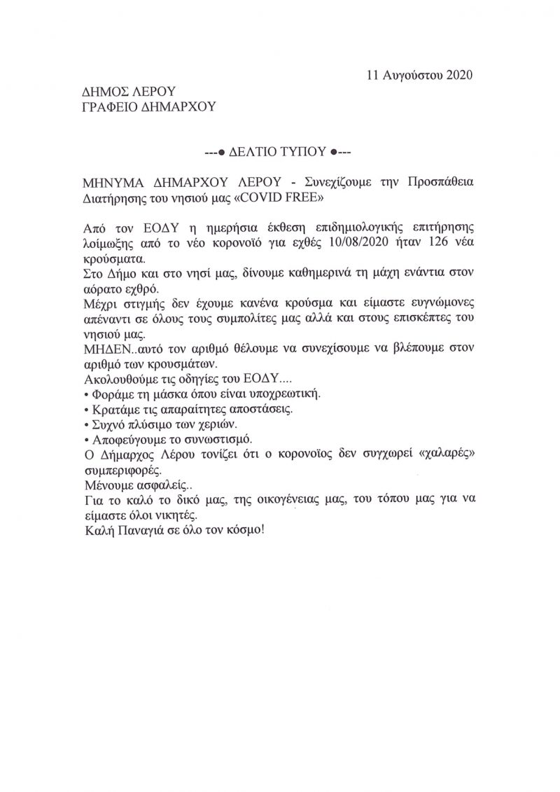 Την ευθύνη διαχείρισης της πανδημίας στο νησί μας την έχει ο Δήμος, αλλά κυρίως ο ΕΟΔΥ, το Κ.Υ Λέρου και η διοίκηση του.