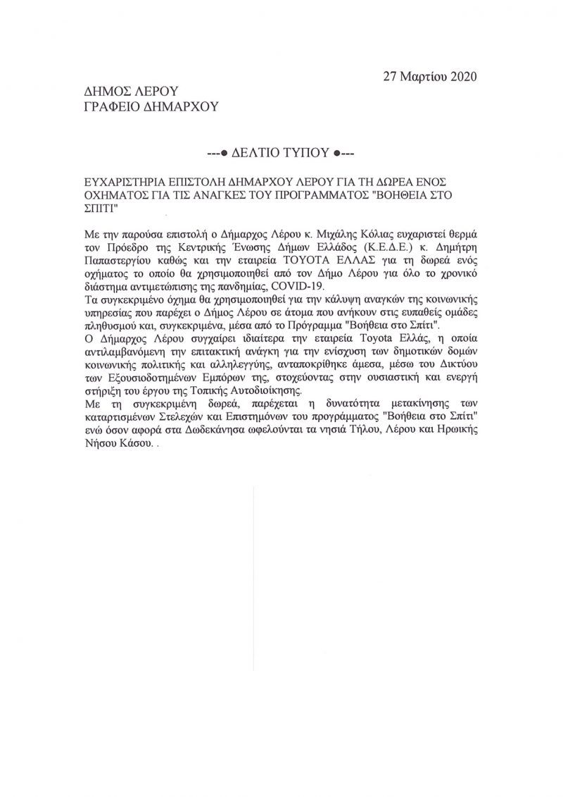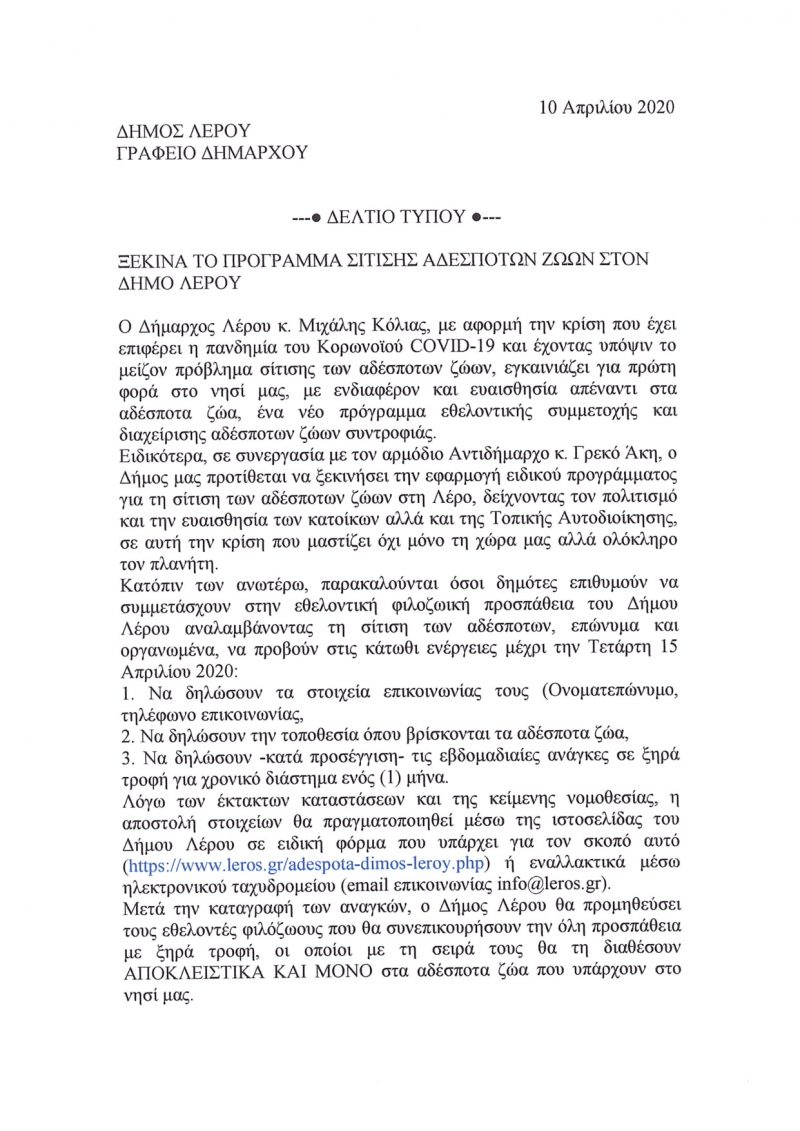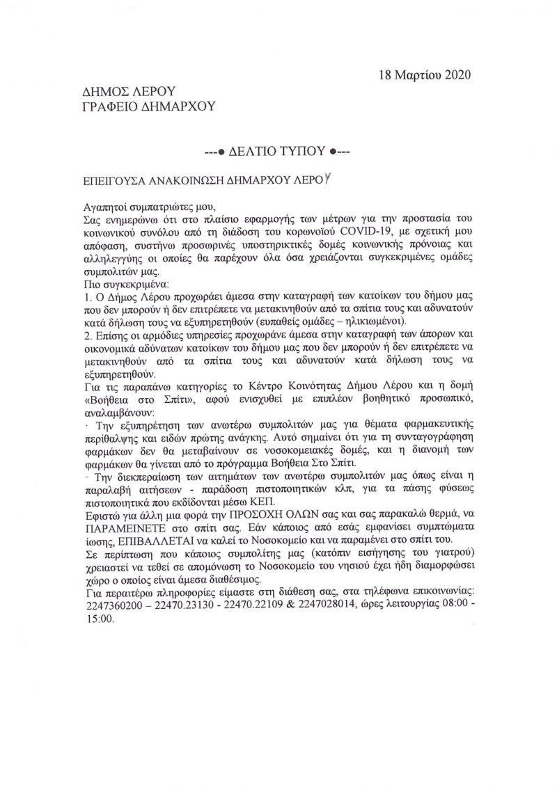 Η Δημοτική Αρχή Λέρου, από την πρώτη στιγμή που η πανδημία «χτύπησε» τη χώρα μας, απέδειξε ότι διαθέτει πολύ γρήγορα αντανακλαστικά και στάθηκε με διακριτικότητα και αμεσότητα στους συνδημότες μας.