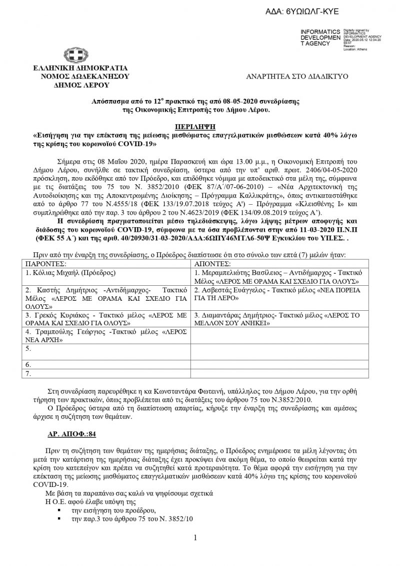 3) «Εισήγηση για την επέκταση της μείωσης μισθώματος επαγγελματικών μισθώσεων κατά 40%λόγω της κρίσης του κορωνοϊού COVID-19 και για τους μήνες Μάιο-Ιούνιο 2020»