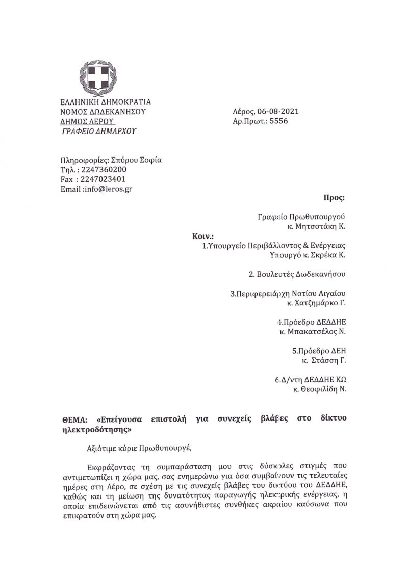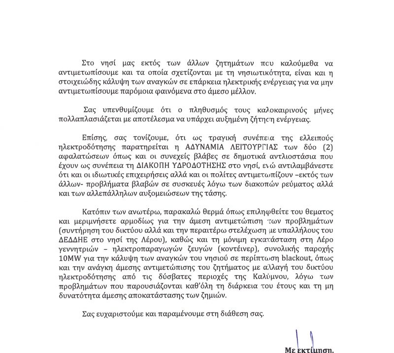 Ακολουθεί η επείγουσα επιστολή του Δημάρχου Λέρου προς το Γραφείο του Πρωθυπουργού: