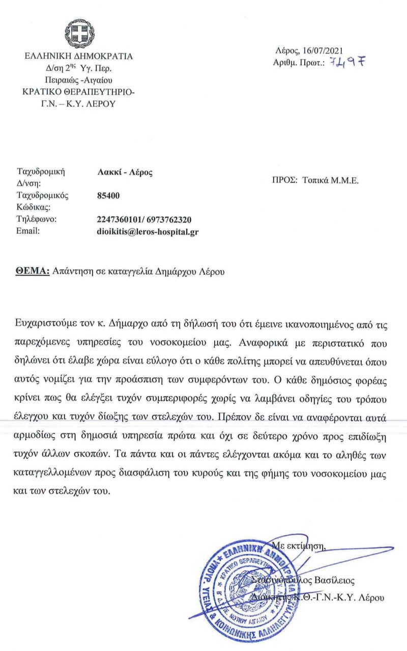 Απάντηση του Διοικητή του Νοσοκομείου σε καταγγελία του Δημάρχου Λέρου