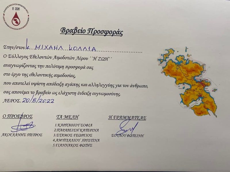 Το Δήμαρχο Λέρου κ.Μιχάλη Κόλια επισκέφθηκαν ο Πρόεδρος του Συλλόγου Εθελοντών Αιμοδοτών Λέρου η “Ζωή ” κ.Πέτρος Ακογλάνης συνοδευόμενος από την Γραμματέα β’ κ.Κατερίνα Παραδείση.