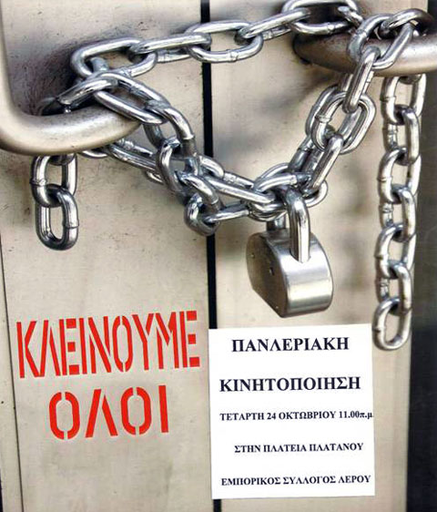 Ο Δήμος Λέρου και οι επαγγελματικοί και κοινωνικοί φορείς του τόπου μας σας καλούν στην πανλεριακή συγκέντρωση την Τετάρτη 24 Οκτωβρίου στις 11 το πρωί στην Πλατεία Πλατάνου για να διαμαρτυρηθούμε για το κλείσιμο της Εφορίας και να αποτρέψουμε τα σχέδια της Κυβέρνησης για τη διάλυση των δημοσίων υπηρεσιών και την ερήμωση των νησιών μας.