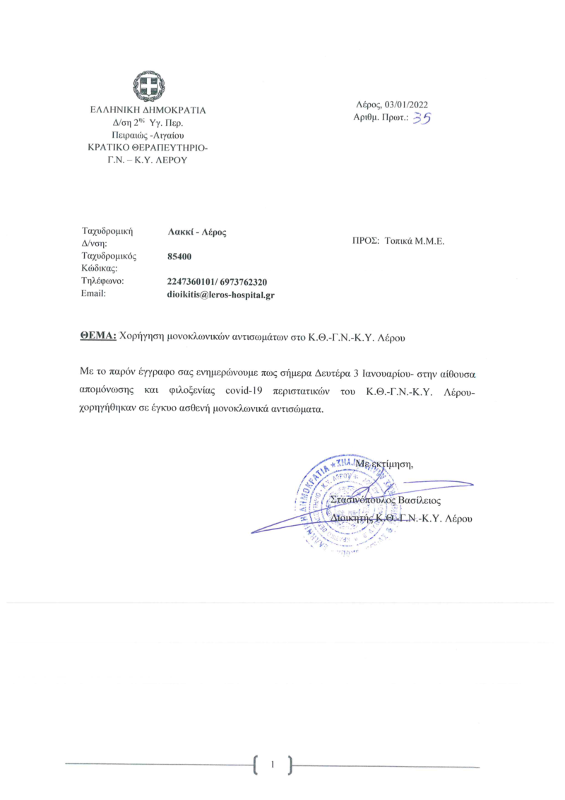 Αρχική » ΟΛΕΣ ΟΙ ΕΙΔΗΣΕΙΣ » ΤΑ ΝΕΑ ΤΗΣ ΛΕΡΟΥ » Χορήγηση μονοκλωνικών αντισωμάτων σε ασθενή του Νοσοκομείου Λέρου