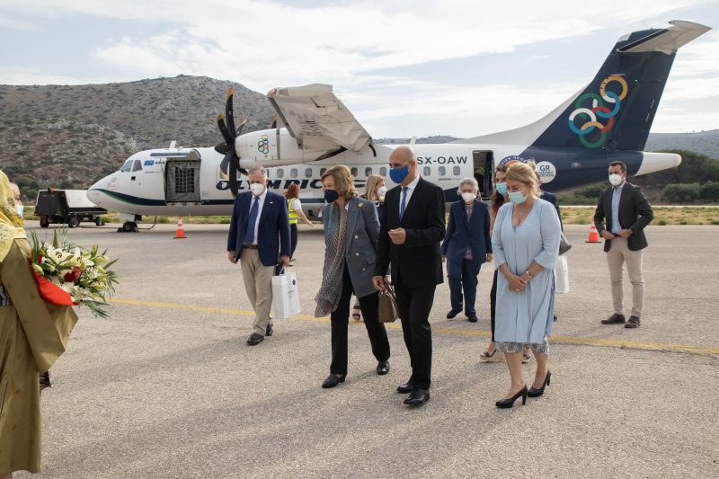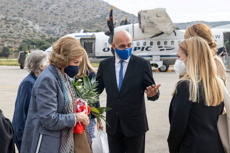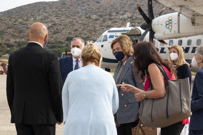 Η Βασίλισσα Σοφία κατέφθασε στη Λέρο με αεροσκάφος της Aegean συνοδευόμενη από την Πριγκίπισσα Ειρήνη, τον Πρέσβη της Ισπανίας στην Ελλάδα κ. Enrique Vinguera, τον υπασπιστή της Βασίλισσας κ. Arturo Coello Villanueva, προσωπικούς φίλους της βασίλισσας, την διευθύντρια γραφείου του Πρέσβη κα Βασιλάκη Μαρία, καθώς και ολιγομελές προσωπικό ασφαλείας.