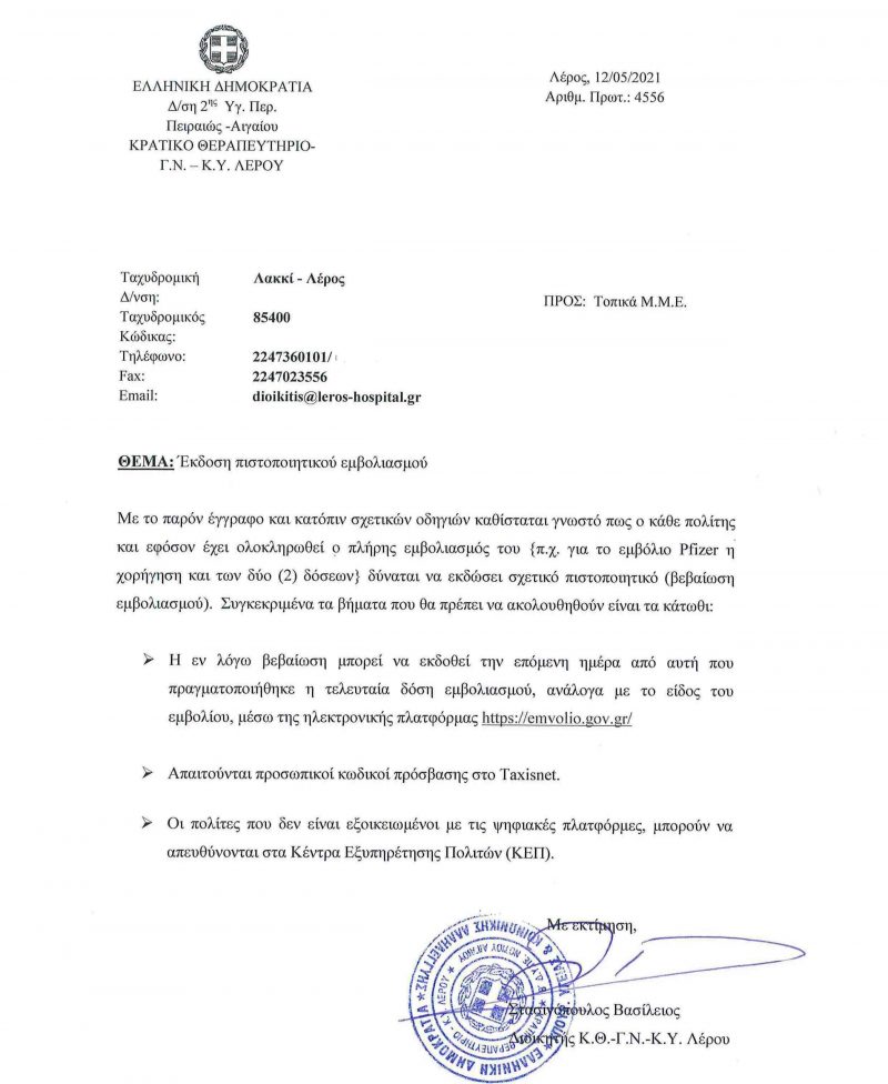 Έγγραφο για την έκδοση πιστοποιητικού εμβολιασμού εξέδωσε ο Διοικητής του Νοσοκομείου Λέρου κ. Στασινόπουλος στο οποίο αναφέρονται τα εξής: