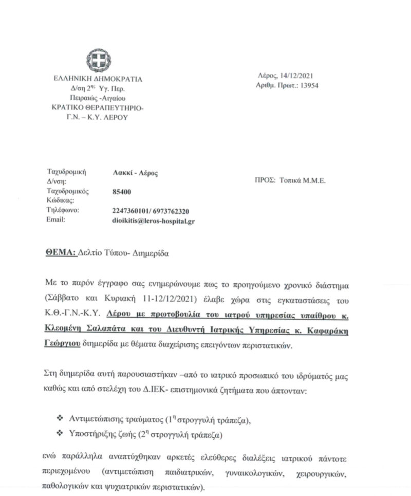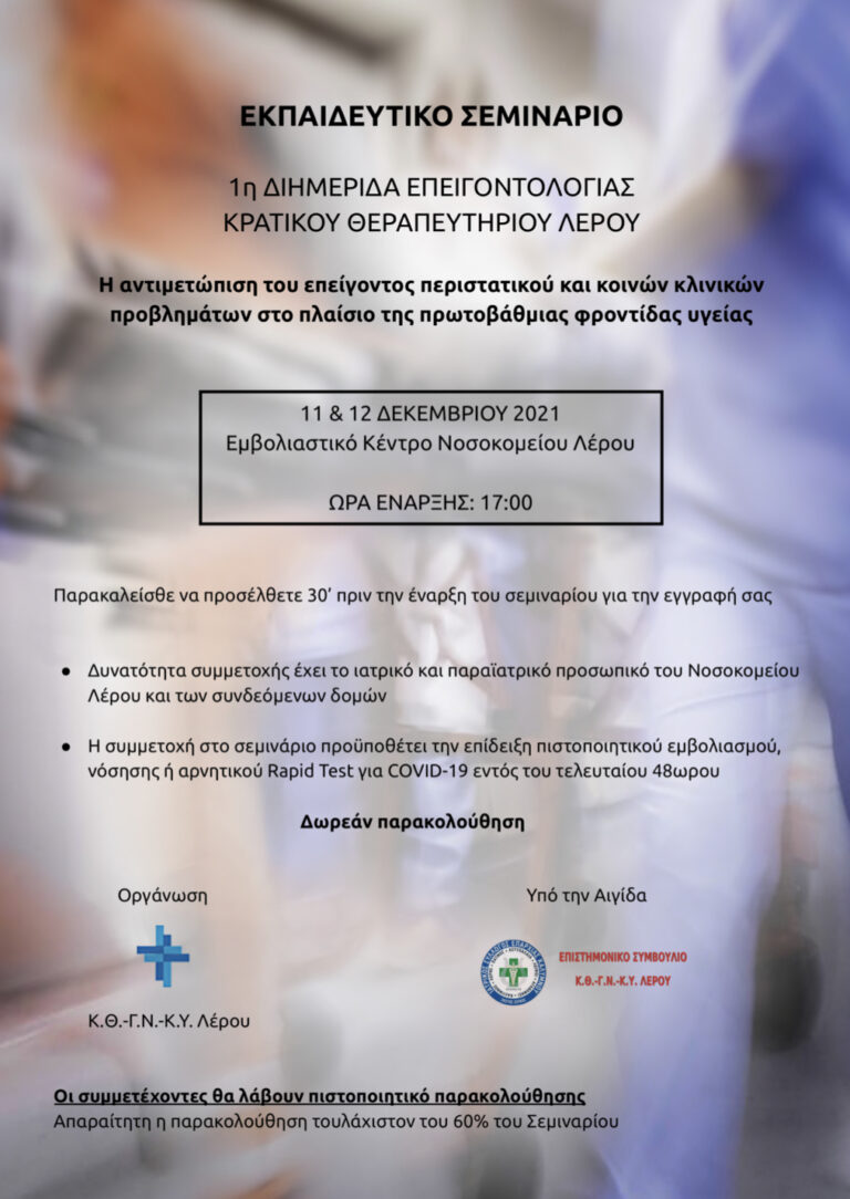 Αρχική » ΟΛΕΣ ΟΙ ΕΙΔΗΣΕΙΣ » ΤΑ ΝΕΑ ΤΗΣ ΛΕΡΟΥ » Διοικητής ΚΘΛ: 1η Διημερίδα Επειγοντολογίας του Κρατικού Θεραπευτηρίου Λέρου