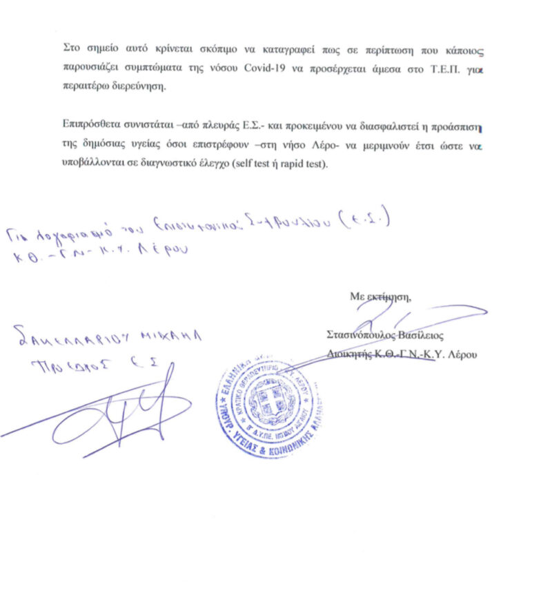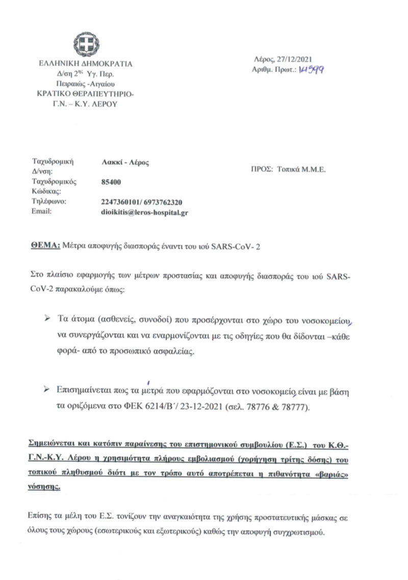 Ανακοίνωση σχετικά με τα μέτρα αποφυγής διασποράς έναντι του ιού SARS-CoV -2 εξέδωσε ο διοικητής του Νοσοκομείου Λέρου κ. Στασινόπουλος στην οποία αναφέρονται τα εξής: