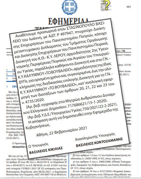 Τελικά οι αρμόδιοι, εν μέσω πανδημίας και μεγάλης διασποράς του ιού στην Κάλυμνο, επέλεξαν να “μεταφέρουν” από την Λέρο τον Διοικητή του εκεί Νοσοκομείου, ο οποίος θα ασκεί “παράλληλα” τα καθήκοντα του και στην Κάλυμνο, με τις συνθήκες να θέτουν ερωτήματα για την άρτια λειτουργία του νοσηλευτικού ιδρύματος του νησιού, αν και όπως αναφέρεται στο σχετικό ΦΕΚ, θα είναι προσωρινό μέχρι να γίνει η κανονική επιλογή του Διοικητή.