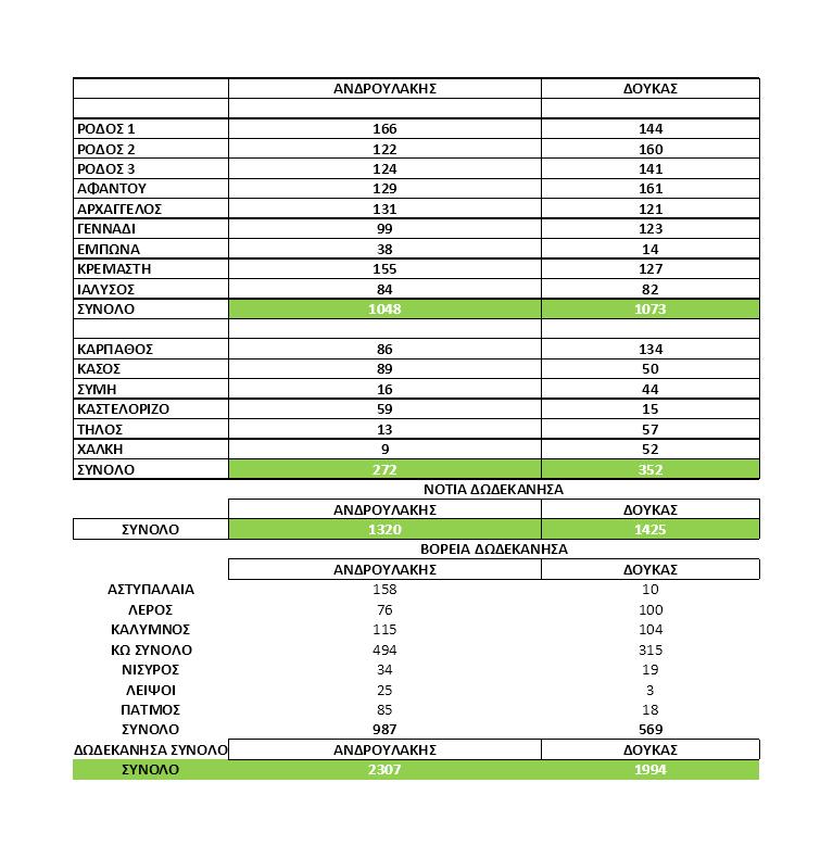 Ειδικότερα στην πόλη της Ρόδου ο Νίκος Ανδρουλάκης έλαβε 1048 ψήφους έναντι 1073 του Χαρη Δούκα. Συνολικά στα νότια Δωδεκάνησα ο Νίκος Ανδρουλάκης 1320 έναντι 1425 του Χάρη Δούκα
