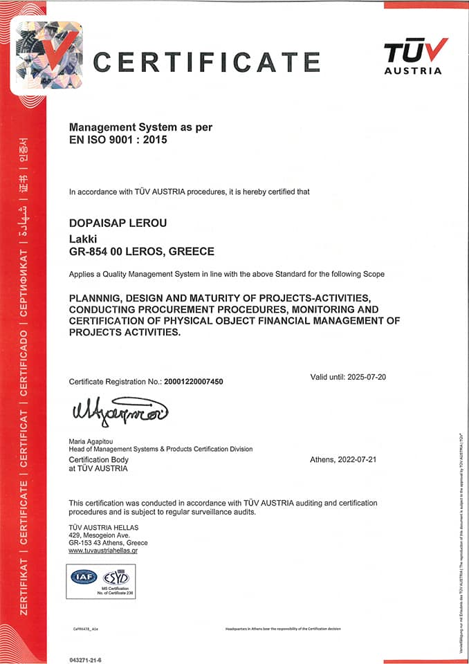 Τη διεθνή πιστοποίηση ISO 9001-2015 απέκτησε ο Δημοτικός Οργανισμός Παιδικών Σταθμών – Αθλητισμού – Πολιτισμού Λέρου, μετά από ενδελεχή επιθεώρηση και έλεγχο των υπηρεσιών του από την TÜV AUSTRIA Hellas, που θεωρείται ο κορυφαίος οργανισμός πιστοποίησης και Επιθεωρήσεων στην Ελλάδα.