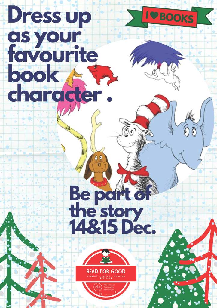 4. 14 – 15 Δεκεμβρίου: Τα παιδιά αποκτούν ρόλο γίνονται μέρος της αγαπημένης τους Ιστορίας. Dress up your favourite Character. Είτε διαζώσης, είτε online τα παιδιά αυτές τις μέρες ντύνονται τον αγαπημένο χαρακτήρα του βιβλίου τους και μοιράζονται στην τάξη το αγαπημένο τους απόσπασμα. Δεν χρειάζεται να αγχωθείτε για τη στολή ένα ραβδάκι και στρογγυλά γυαλιά αρκούν για τον Harry Potter.