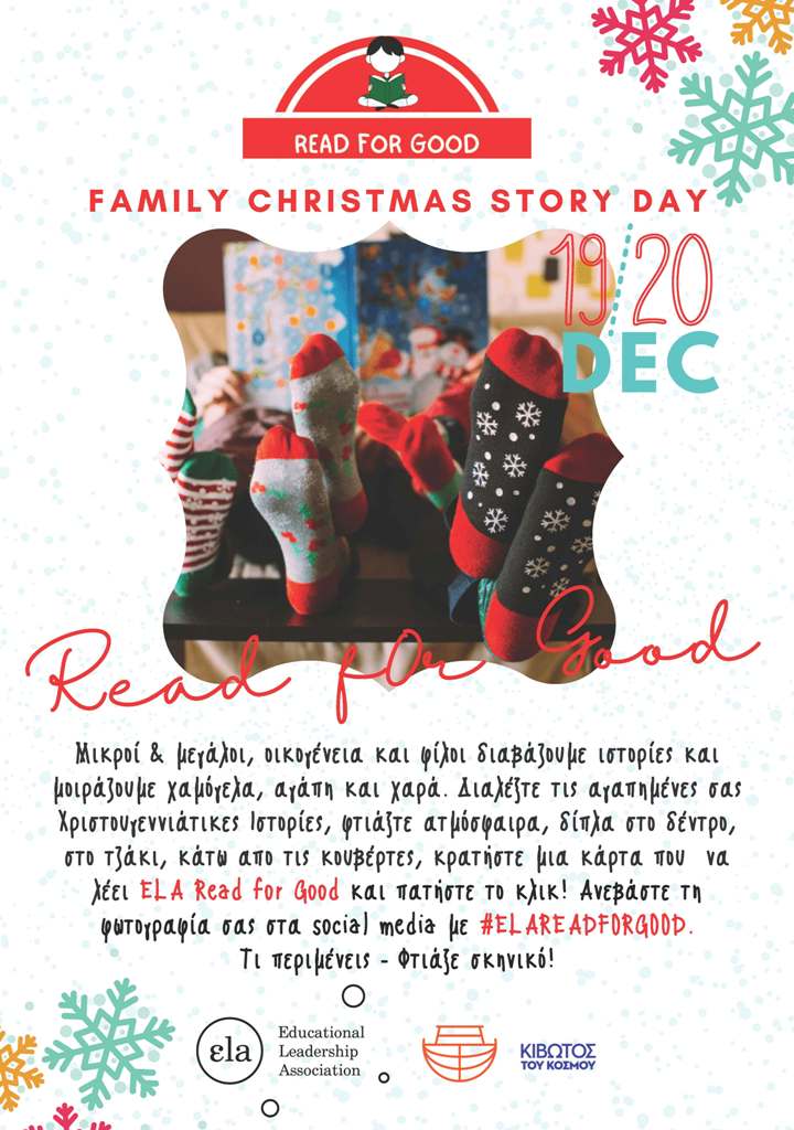 5. 19 – 20 Δεκεμβρίου: Ένα σαββατοκύριακο που θα ενώσει όλους όσοι βρίσκονται στο ίδιο σπίτι. Πως; Διαλέξτε την ή τις αγαπημένες σας ιστορίες, βρείτε το αγαπημένο σας μέρος για να διαβάσετε όλοι μαζί, φορέστε κάτι Χριστουγεννιάτικο, γράψτε σε μια κάρτα ELA Read For Good, χαμογελάστε και βγάλτε μια φωτογραφία όλοι μαζί. Ανεβάστε την στα Social Media και ενισχύστε με 5 επιπλέον ευρώ το σκοπό.
