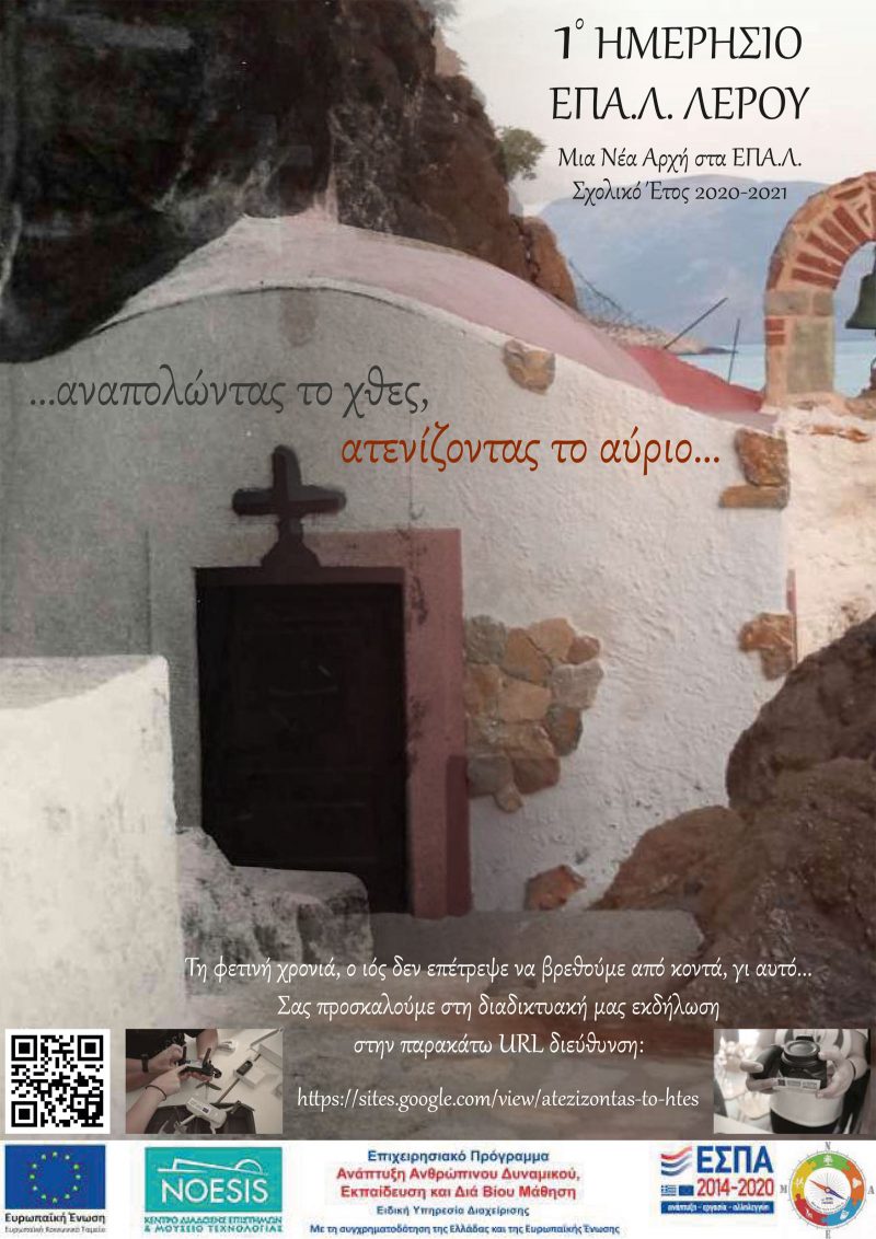 Το 1ο Ημερήσιο ΕΠΑ.Λ. Λέρου, λόγω των ιδιαίτερων συνθηκών που επικρατούν εξαιτίας της πανδημίας του covid 19, διοργανώνει διαδικτυακή εκδήλωση διάχυσης πεπραγμένων του Σχεδίου Δράσης «…αναπολώντας το χθες, ατενίζοντας το αύριο…», που περιλαμβάνει Έκθεση Φωτογραφίας με τίτλο Τίποτα δεν έχει αλλάξει, και τίποτα δεν είναι όπως παλιά, την παρουσίαση τουριστικού οδηγού που δημιούργησαν οι μαθητές και οι μαθήτριες προκειμένου να προβληθούν οι ομορφιές του νησιού της Λέρου, καθώς και όλη την πορεία υλοποίησης του Σχεδίου Δράσης.