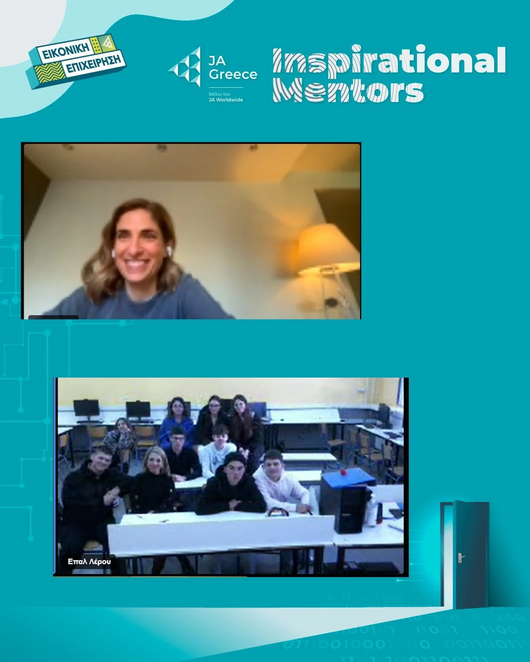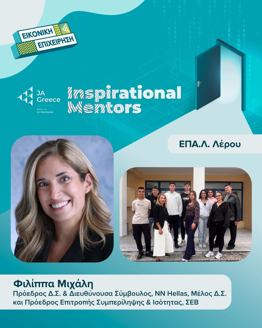Με ιδιαίτερη χαρά και υπερηφάνεια, το ΕΠΑ.Λ. Λέρου ανακοινώνει ότι η μαθητική εικονική επιχείρηση “ReSea Leros – Blue Action Kits”, στο πλαίσιο του διαγωνισμού JA Greece – Εικονική Επιχείρηση 2025–2026, είχε την τιμή να πραγματοποιήσει διαδικτυακή συνάντηση με την Inspirational Mentor της ομάδας, κα Φιλίππα Μιχάλη, Πρόεδρο Δ.Σ. & Διευθύνουσα Σύμβουλο της NN Hellas, καθώς και Μέλος Δ.Σ. και Πρόεδρο της Επιτροπής Συμπερίληψης & Ισότητας του ΣΕΒ.
