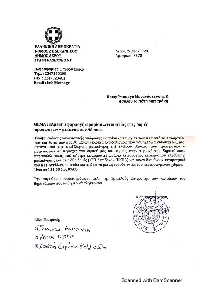 Το Σάββατο 27 Ιουνίου 2020, ο Δήμαρχος Λέρου κ. Μιχάλης Κόλιας, μετά από συνάντηση με κατοίκους του Ξηροκάμπου οι οποίοι πλήττονται από την παραβατική συμπεριφορά προσφύγων – μεταναστών, απέστειλε επιστολή στον Υπουργό Μετανάστευσης και Ασύλου κ. Μηταράκη, ζητώντας την άμεση εφαρμογή ωραρίου περιορισμού κυκλοφορίας στο ΚΥΤ Λέρου, από τις 21.00 έως την 07.00.