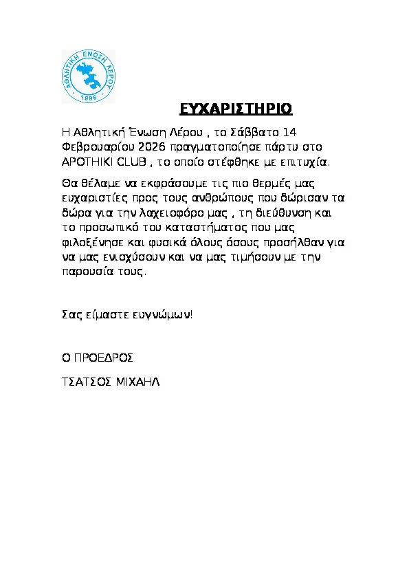 ΕΥΧΑΡΙΣΤΗΡΙΟ – “Η Αθλητική Ένωση Λέρου, το Σάββατο 14 Φεβρουαρίου 2026 πραγματοποίησε πάρτυ στο ΑΡΟΤΗΚΗ CLUB , το οποίο στέφθηκε με επιτυχία.
