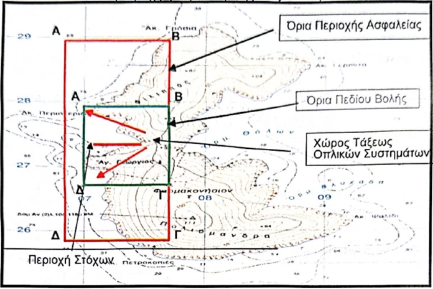 Στην παραπάνω περιοχή είναι απαγορευμένη η παραμονή και διέλευση ανθρώπων, ζώων και πλωτών μέσων κατά το χρονικό διάστημα που θα εκτελούνται βολές, για αποφυγή ατυχημάτων.