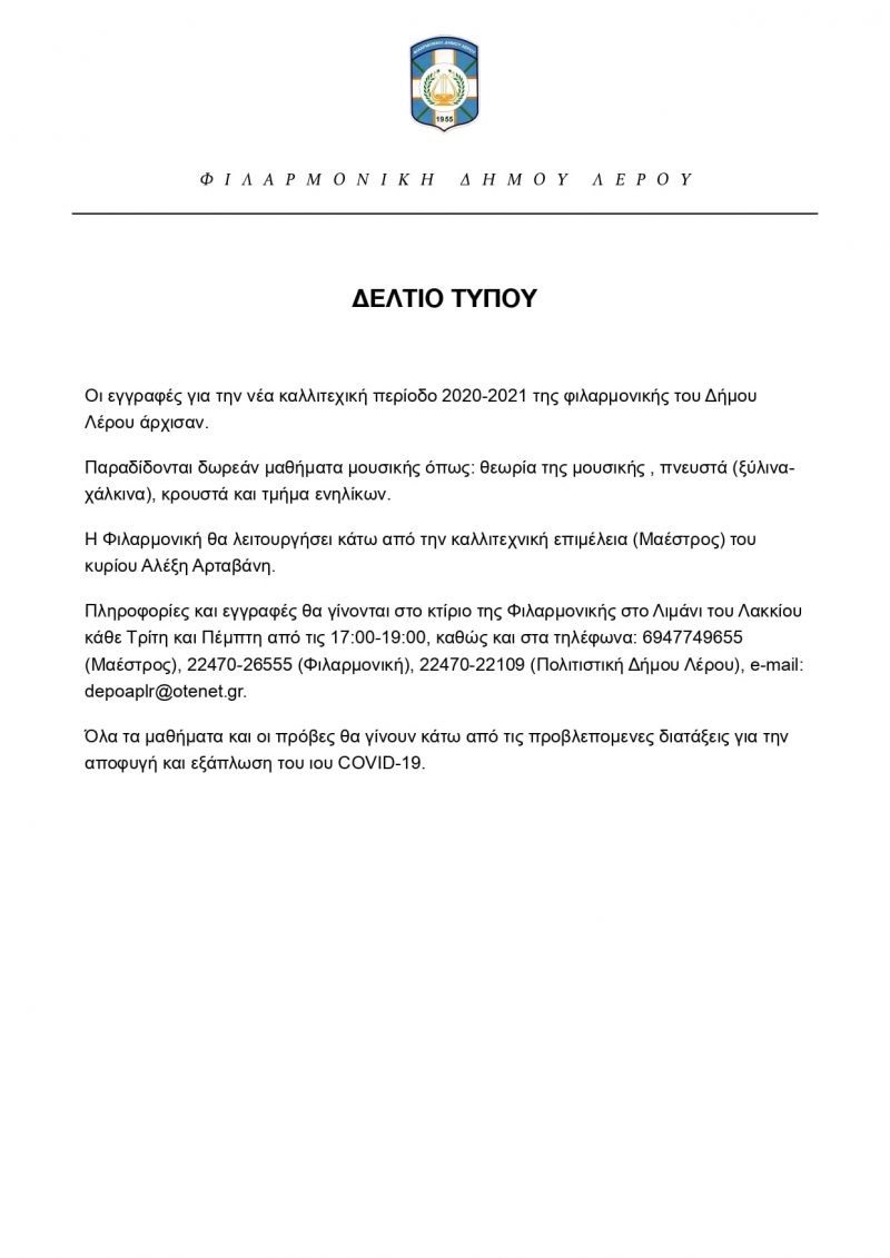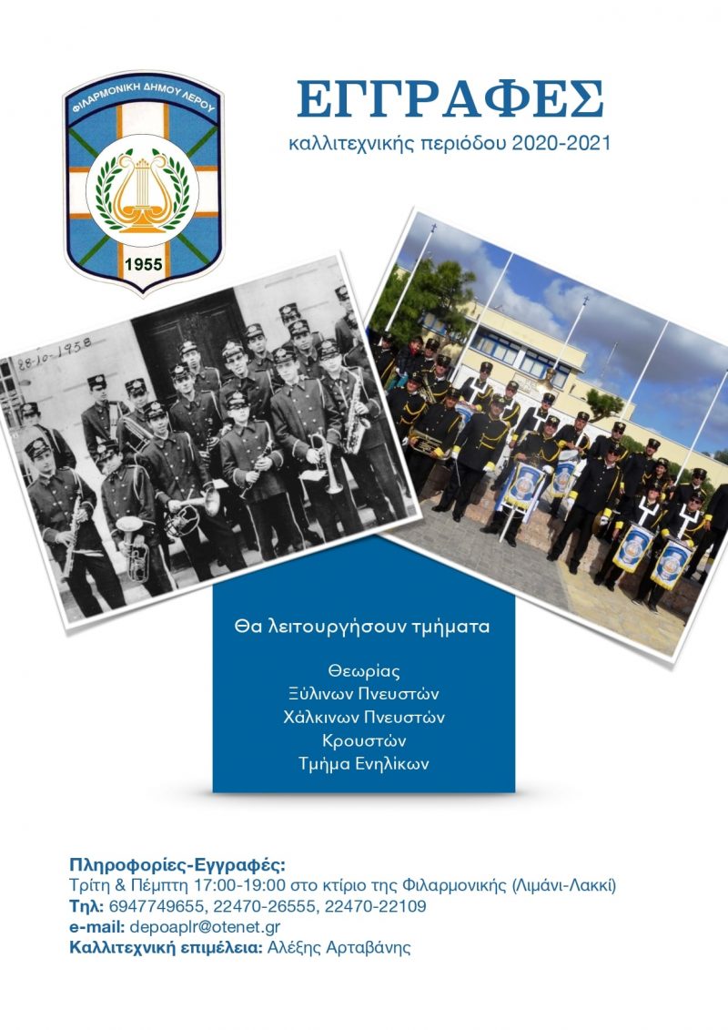 Αρχική » ΟΛΕΣ ΟΙ ΕΙΔΗΣΕΙΣ » ΤΑ ΝΕΑ ΤΗΣ ΛΕΡΟΥ » Φιλαρμονική Δήμου Λέρου: Εγγραφές νέας καλλιτεχνικής περιόδου 2020-2021