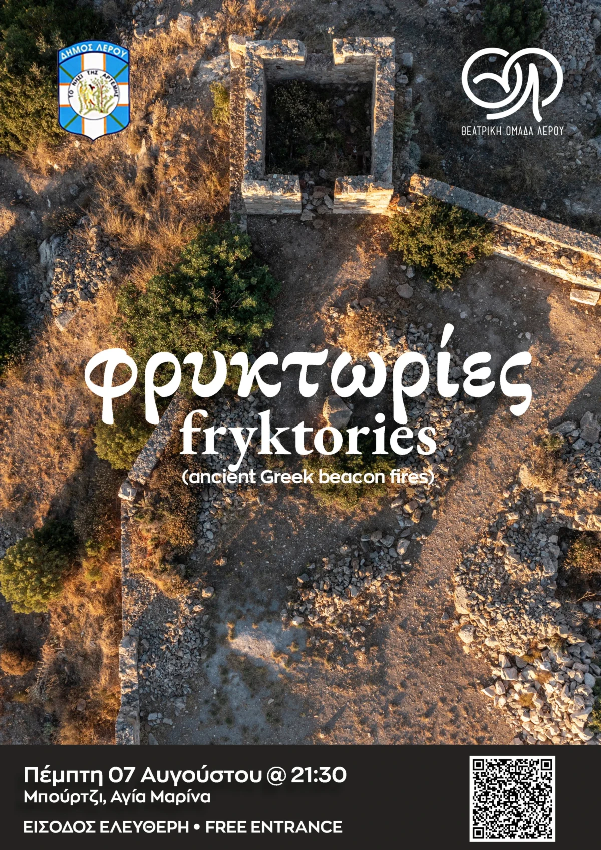 Ο Δήμος Λέρου σε συνεργασία με την Θεατρική Ομάδα Λέρου, την Πέμπτη 07 Αυγούστου και ώρα 9.30μ.μ. πλησίον του Μπουρτζίου, στην αυλή του Αλευρόμυλου, θα παρουσιάσουν για πρώτη φορά εκδήλωση με θέμα τις φρυκτωρίες του νησιού μας από την εποχή του Ομήρου.
