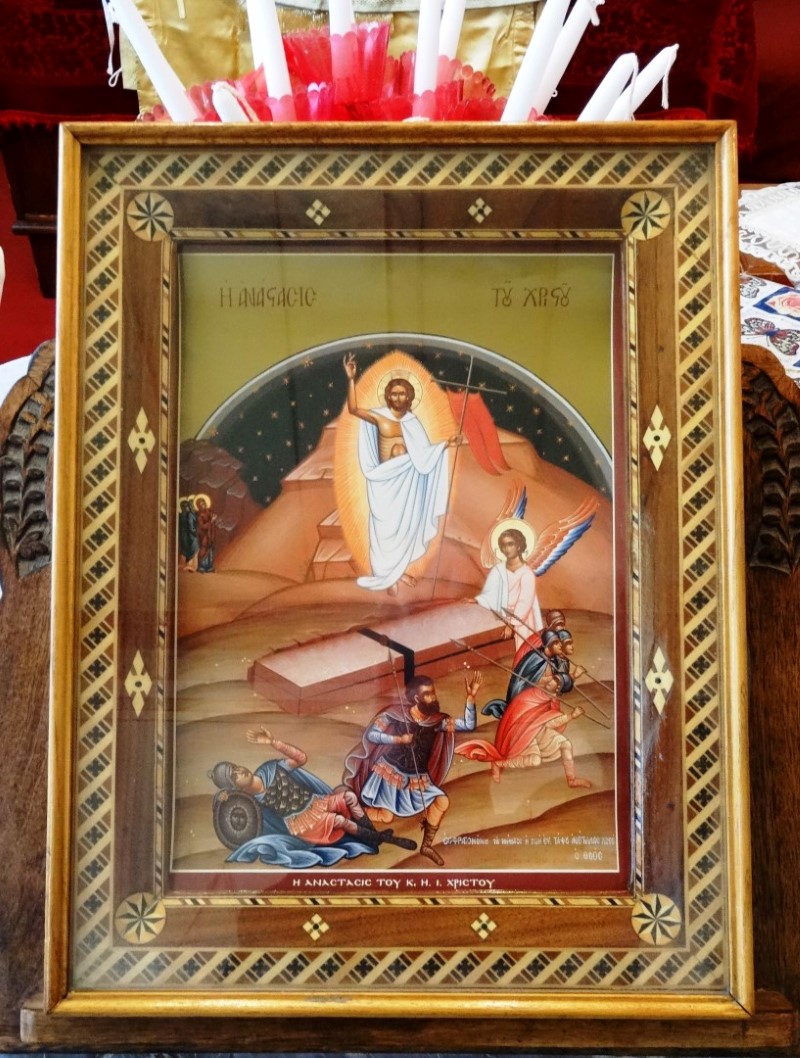 Οι γυναίκες και μαθήτριες του Χριστού πηγαίνουν με μύρα στον τάφο για να Του προσφέρουν τις ύστατες τιμές της αγάπης τους. Φθάνοντας στον τάφο τον βλέπουν κενό! Και ο λευκοφορεμένος Άγγελος τους διακηρύττει την Ανάσταση: «Ηγέρθη ο Κύριος!».