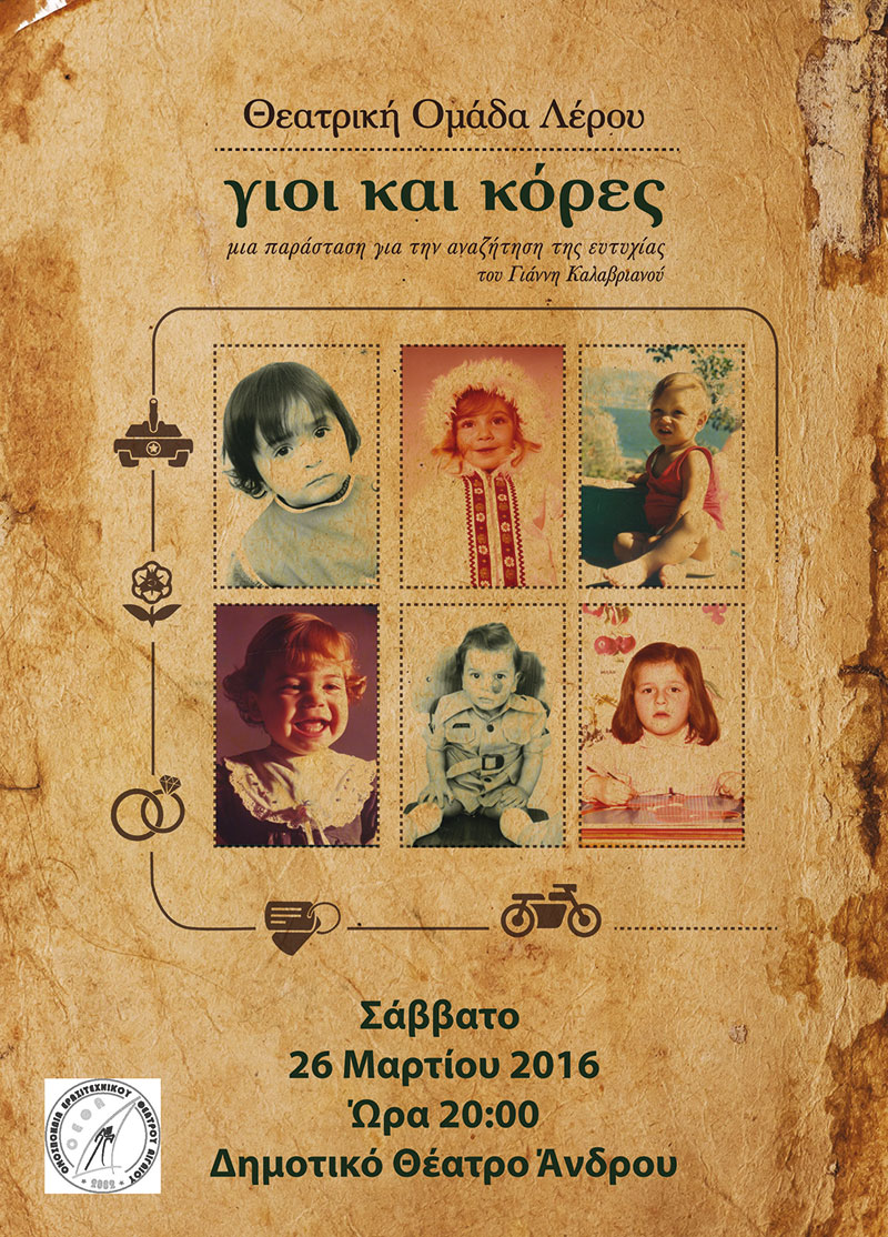 Η Ομοσπονδία Ερασιτεχνικού Θεάτρου Αιγαίου (ΟΕΘΑ) σε συνεργασία με την Θεατρική Ομάδα Λέρου, τον Δήμο Άνδρου, την Λαϊκή Σκηνή Άνδρου και τον Θεατρικό Όμιλο Άνδρου διοργανώνει το Σάββατο 26 Μαρτίου 2016 στις 20.00 μ. μ. στο Δημοτικό Θέατρο Χώρας Άνδρου εορταστική εκδήλωση για την Παγκόσμια Ημέρα Θεάτρου 2016, την οποία τιμά με μια παράσταση, που παρουσιάσθηκε στη Πάτμο στο πλαίσιο της 27ης Συνάντησης Ερασιτεχνικών Θιάσων Αιγαίου από την Θεατρική Ομάδα Λέρου. Η συγκεκριμένη παράσταση παρουσιάστηκε και στην Λέρο από την ομάδα το 2015 τους μήνες Μάρτιο και Αύγουστο για 5 συνολικά παραστάσεις. Κατά την διάρκεια της συγκεκριμένης εκδήλωσης, θα αναγνωστεί το μήνυμα της Παγκόσμιας Ημέρας Θεάτρου 2016.