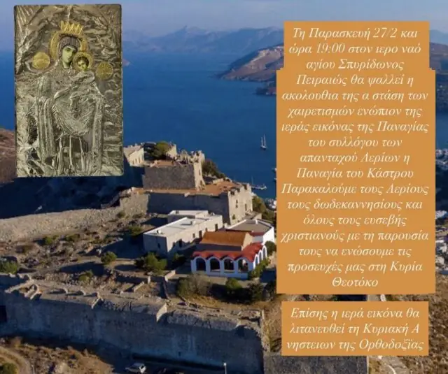 Με ιδιαίτερη συγκίνηση, η Πανελλήνια Ένωση Λερίων μεταφέρει την ιερά εικόνα της Παναγίας του Κάστρου, το αντίγραφο του Συλλόγου μας, στον Ιερό Ναό Αγίου Σπυρίδωνος στο Πειραιά.