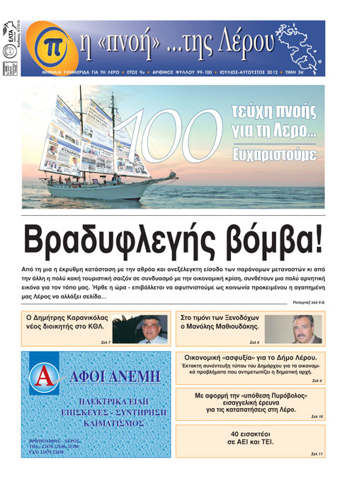 Κυκλοφόρησε το τεύχος Ιουλίου – Αυγούστου της εφημερίδας “η Πνοή της Λέρου”, με πολιτικά τοπικά δρώμενα, γεγονότα κοινωνικού περιεχομένου και σχολιασμού, και όπως πάντα, τις θέσεις και απόψεις των συντακτών της. Καθώς ξεφυλλίζετε θα βρείτε πολλά κείμενα που θα σας τραβήξουν το ενδιαφέρον.