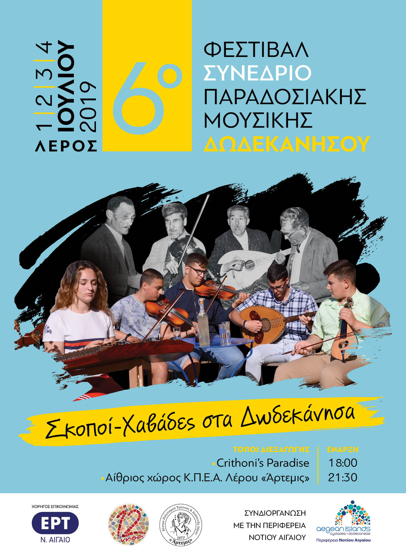 Το Κέντρο Πολιτισμού, Έρευνας και Ανάπτυξης Λέρου «Άρτεμις» και η Περιφέρεια Νοτίου Αιγαίου συνδιοργανώνουν το 6ο Φεστιβάλ-Συνέδριο παραδοσιακής μουσικής Δωδεκανήσου, στις 1,2,3 και 4 Ιουλίου 2019 στη Λέρο με τίτλο «Σκοποί και χαβάδες στα Δωδεκάνησα».
