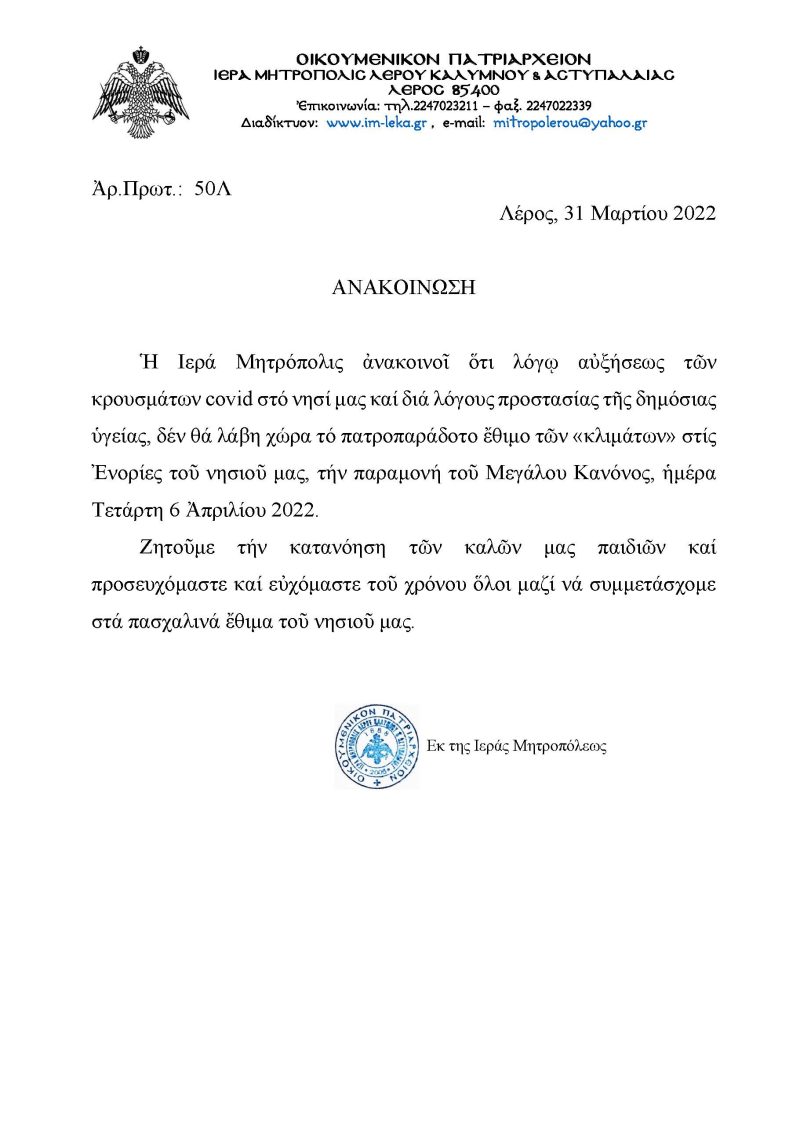 Αρχική » ΟΛΕΣ ΟΙ ΕΙΔΗΣΕΙΣ » ΤΑ ΝΕΑ ΤΗΣ ΛΕΡΟΥ » ΛΕΡΟΣ: ΑΝΑΚΟΙΝΩΣΗ ΑΚΥΡΩΣΗΣ ΤΟΥ ΕΘΙΜΟΥ ΤΩΝ ΚΛΙΜΑΤΩΝ