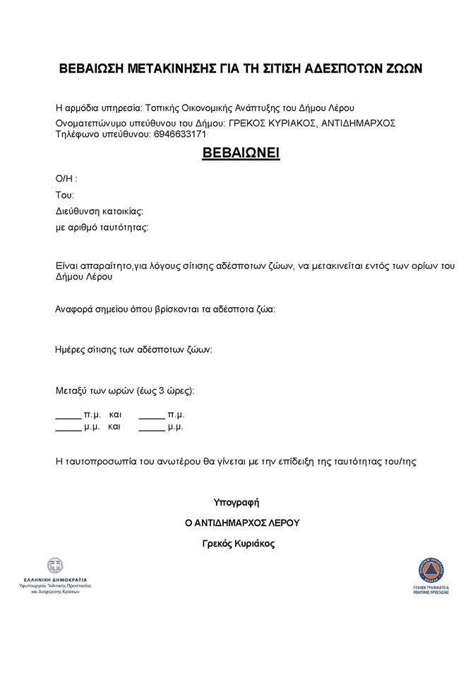 Σημειώνεται ότι στη βεβαίωση οι πολίτες θα πρέπει να συμπληρώσουν το σημείο που βρίσκονται τα αδέσποτα, τις ημέρες και ώρες της σίτισης, ενώ η διάρκεια της μετακίνησης δεν θα πρέπει να ξεπερνά τις τρεις ώρες.