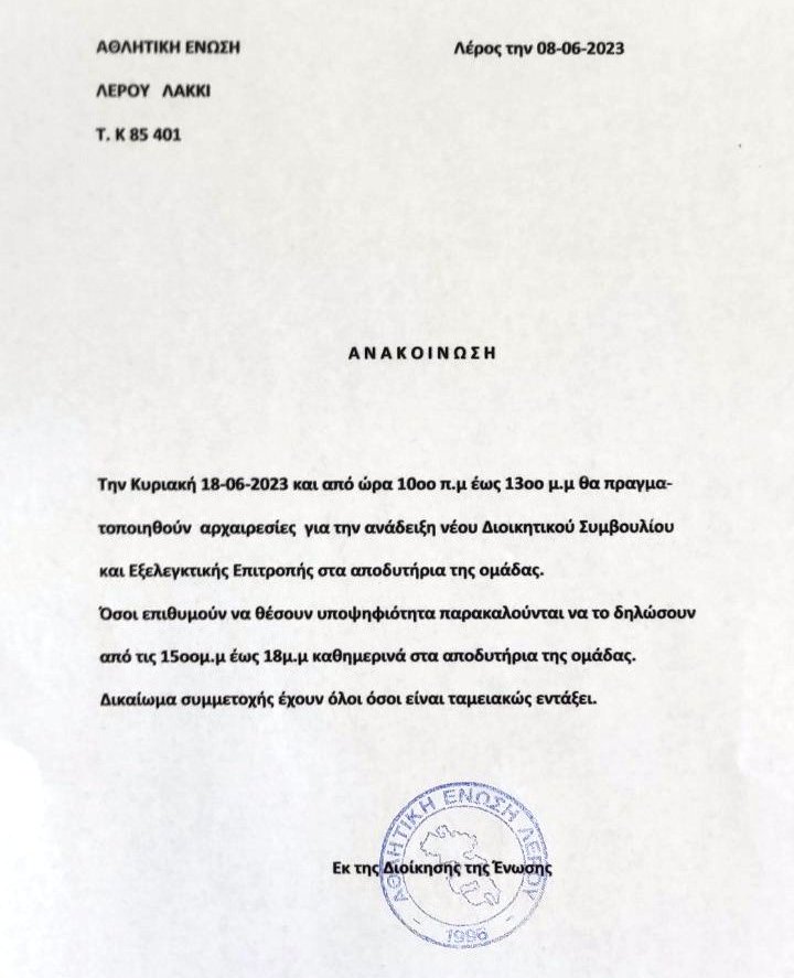 Λέρος: Ανακοίνωση – προκήρυξη εκλογών στην Αθλητική Ένωση Λέρου