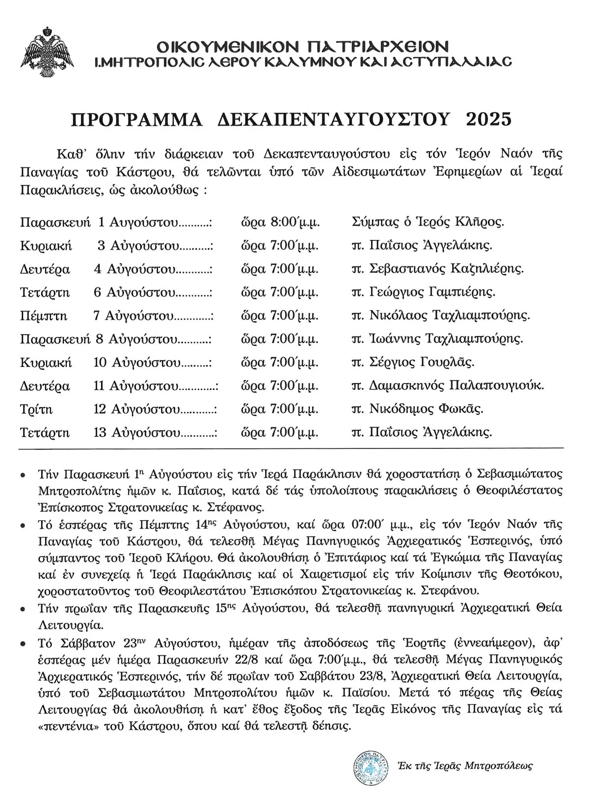 Από την Ιερά Μητρόπολη Λέρου Καλύμνου και Αστυπάλαιας ανακοινώθηκε το πρόγραμμα του Δεκαπενταύγουστου 2025, όπως παρακάτω: