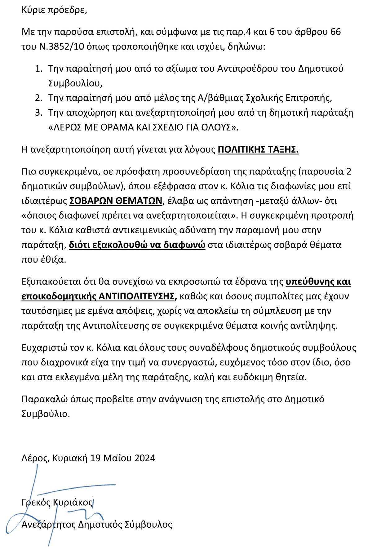 Με την παρούσα επιστολή, και σύμφωνα με τις παρ.4 και 6 του άρθρου 66 του Ν.3852/10 όπως τροποποιήθηκε και ισχύει, δηλώνω: