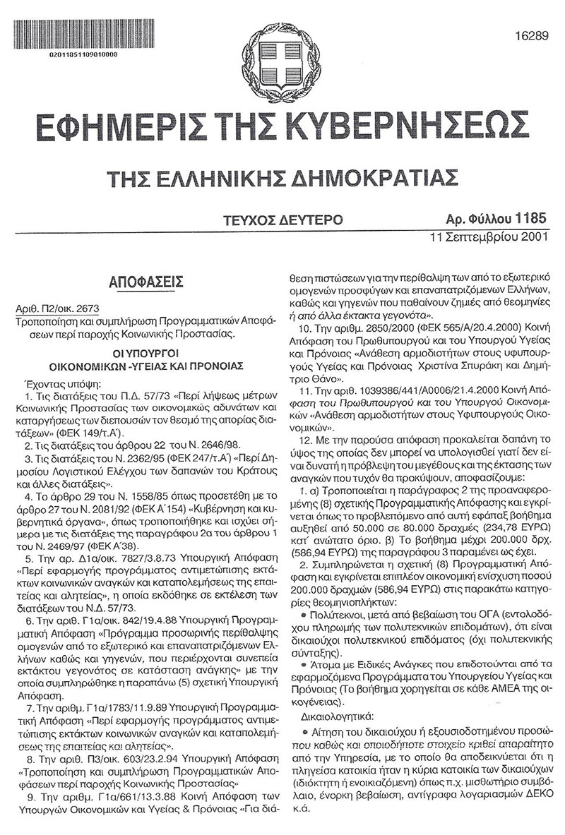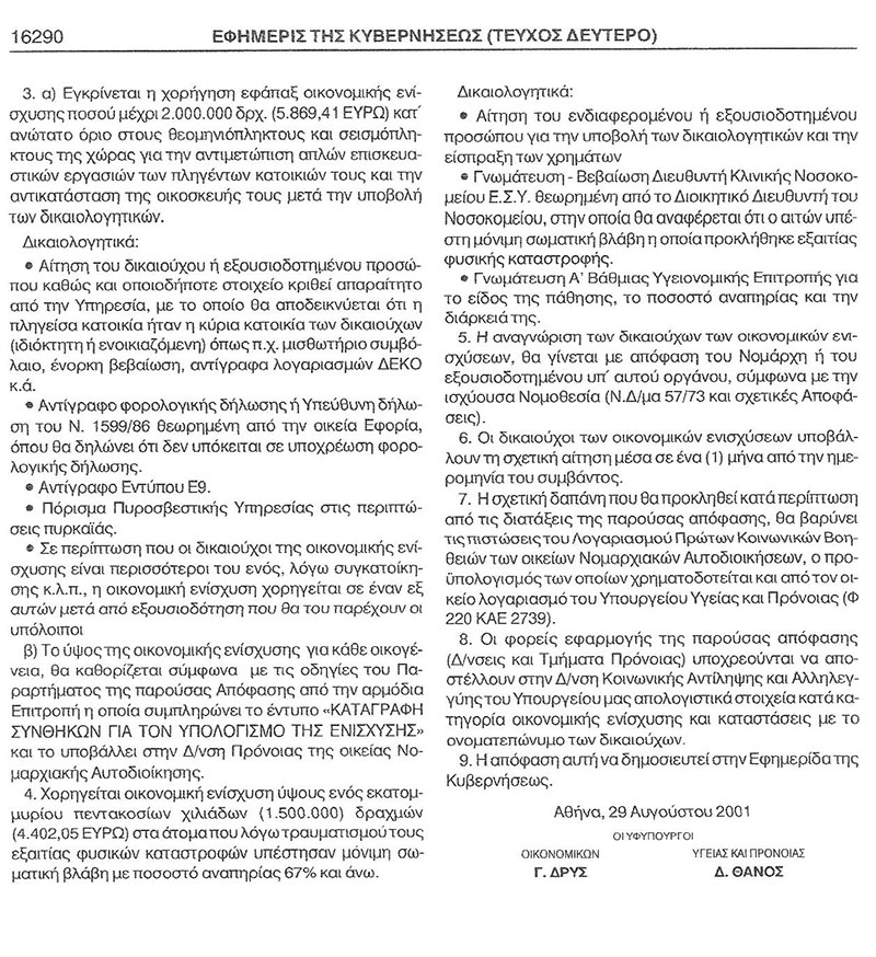 Δεν αναφέρει επίσης ότι για την καταβολή των αποζημιώσεων, οι πληγέντες αξιολογήθηκαν από αρμόδιες επιτροπές οι οποίες έκαναν επιτόπια καταγραφή, ούτε φυσικά αναφέρει πως για την καταβολή των αποζημιώσεων εμπλέκονται δεκάδες υπηρεσίες και υπουργεία, και, όσοι συμπολίτες μας υπέστησαν ζημιές από τη θεομηνία, θα αποζημιωθούν, με βάση την καταγραφή που είχε γίνει, αλλά και το ΦΕΚ1185//11-9-2001, το οποίο επισυνάπτεται.
