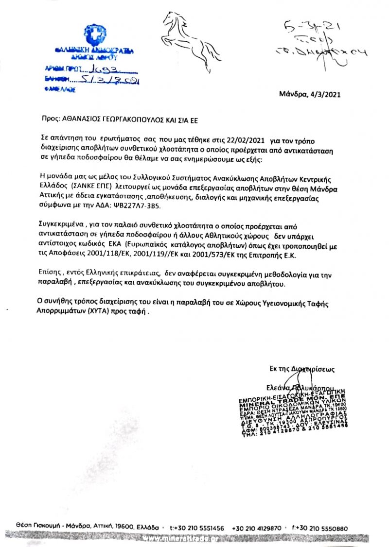 ΑΠΑΝΤΗΣΗ ΔΗΜΑΡΧΟΥ ΛΕΡΟΥ ΣΧΕΤΙΚΑ ΜΕ ΤΗΝ ΑΝΑΚΥΚΛΩΣΗ ΤΟΥ ΣΥΝΘΕΤΙΚΟΥ ΤΑΠΗΤΑ ΓΗΠΕΔΟΥ ΛΑΚΚΙΟΥ