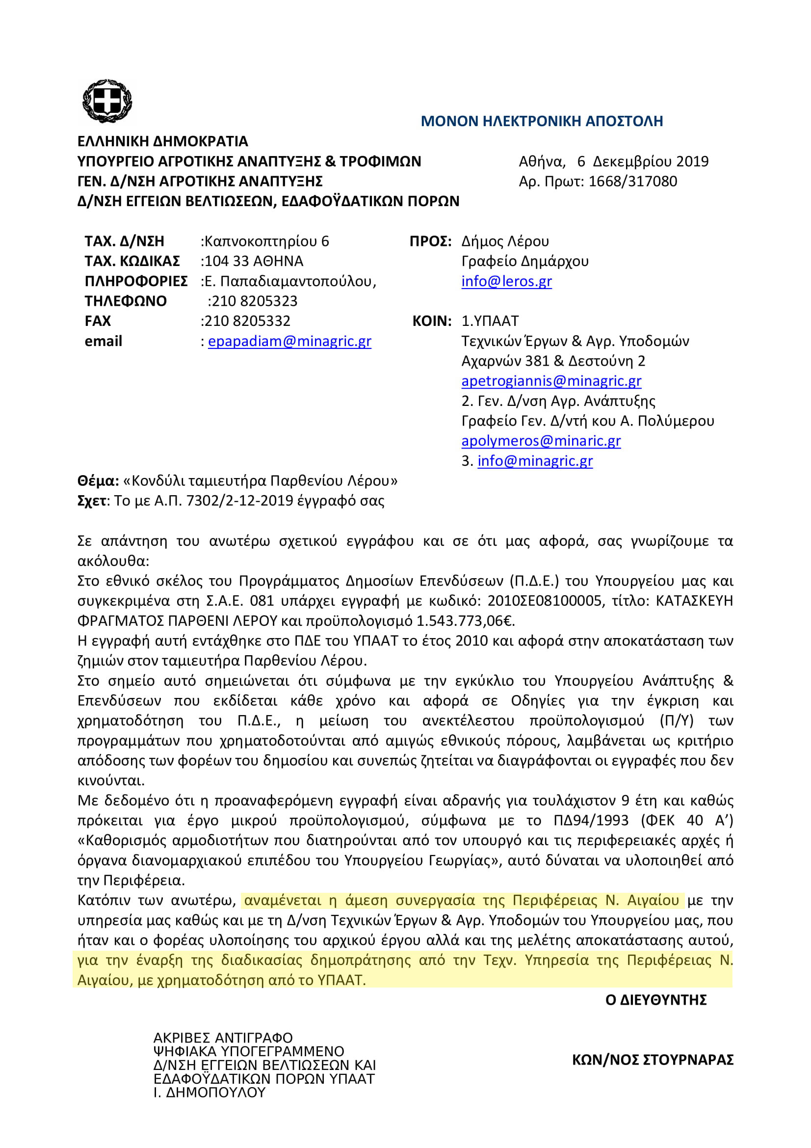 - Την 15η Φεβρουαρίου 2019 ο Δήμος Λέρου απέστειλε στην Περιφέρεια Νοτίου Αιγαίου αίτημα ένταξης (αρ.πρωτ. 946//14-2-2019) για το έργο «Συμπληρωματικές εργασίες στο Φράγμα παρθενίου Νήσου Λέρου, προϋπολογισμού 1.573.494,83 €», προκειμένου το έργο να ενταχθεί στο ΠΑΑ 2014-2020. (Βλ. δελτίο Τύπου: https://admin.lerosnews.gr/ta-nea-tis-lerou/simantikes-epafes-tou-dimarxou-lerou-stin-athina)
