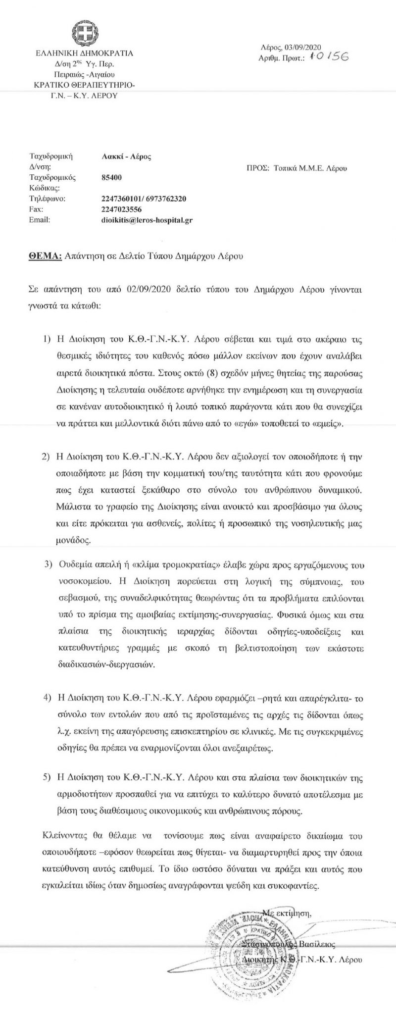 Απαντητική επιστολή στη χθεσινή καταγγελία του Δημάρχου Λέρου εξέδωσε ο Διοικητής του Νοσοκομείου Λέρου κ. Στασινόπουλος, στην οποία αναφέρει τα εξής: