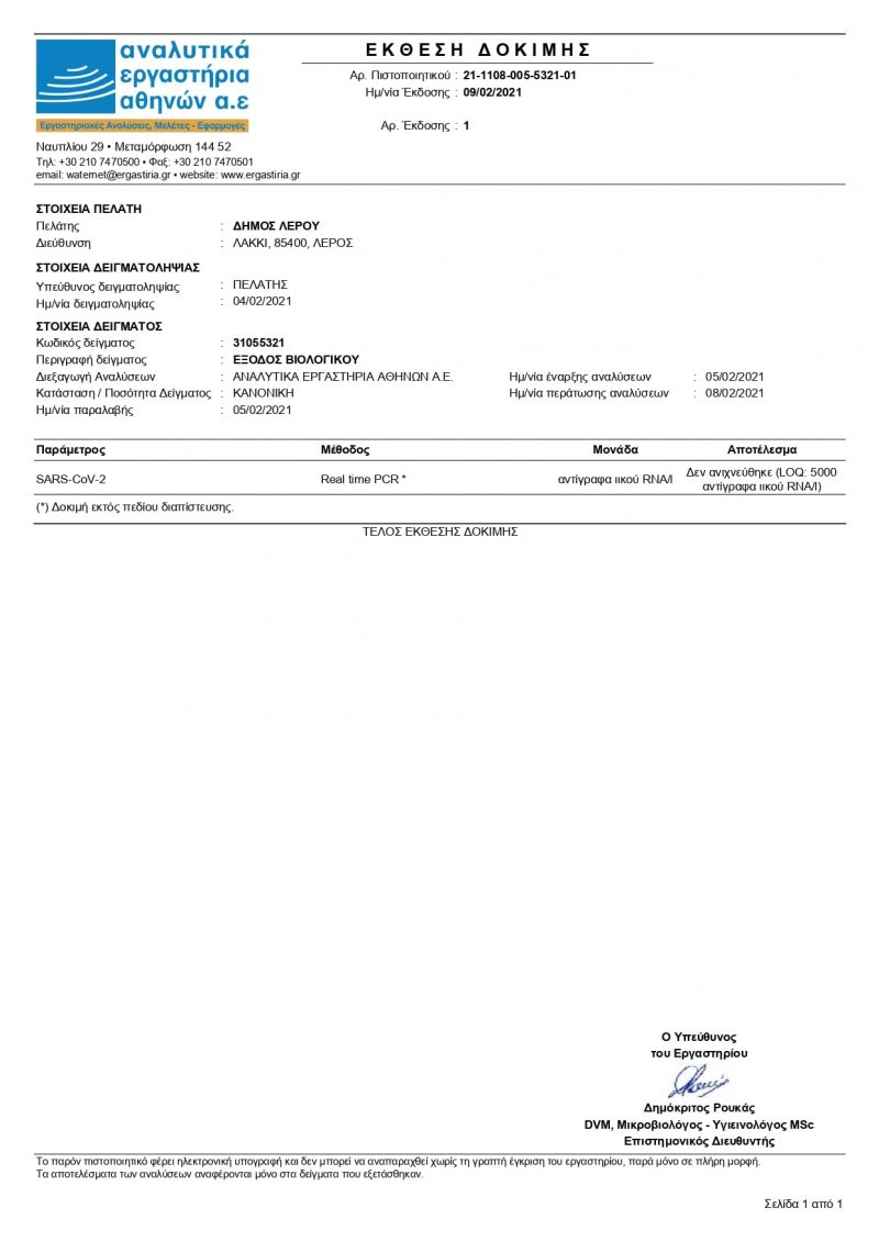 Αρνητική για έβδομη φορά η δειγματοληψία που πραγματοποιήθηκε στις 04 Φεβρουαρίου 2021, από τον βιολογικό καθαρισμό στο Παντέλι.