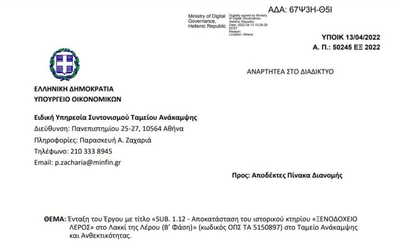 Ο Δήμαρχος Λέρου ανακοινώνει ότι με την υπ’ αρ. 50245/13-04-2022 απόφαση του αναπληρωτή Υπουργού Οικονομικών κ. Θεόδωρου Σκυλακάκη εντάσσεται στο ταμείο ανάκαμψης και ανθεκτικότητας το έργο με τίτλο «Αποκατάστασης του Ιστορικού Κτιρίου Ξενοδοχείο Λέρος» στο Λακκί της Λέρου με το ποσό των 2.197.323,43 € και χρονοδιάγραμμα υλοποίησης το έτος 2024.