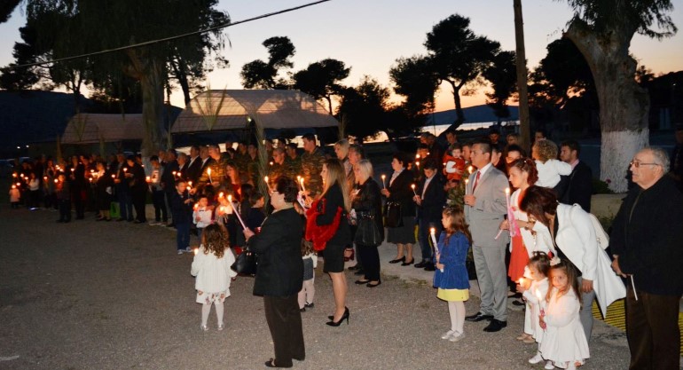 Το μεσημέρι στις 12 οι καμπάνες όλων των Ενοριών κτυπούν χαρμόσυνα. Κροτίδες, φωτοβολίδες και χαρούμενες ευχές ενώνονται με την καταπράσινη και μυρωδάτη φύση, και δίδουν πλέον τον πανηγυρικό τόνο με τον κελαΐδισμα των πουλιών και την κατάκαρδη ευχή ο ένας προς τον άλλον «Καλή Ανάσταση».
