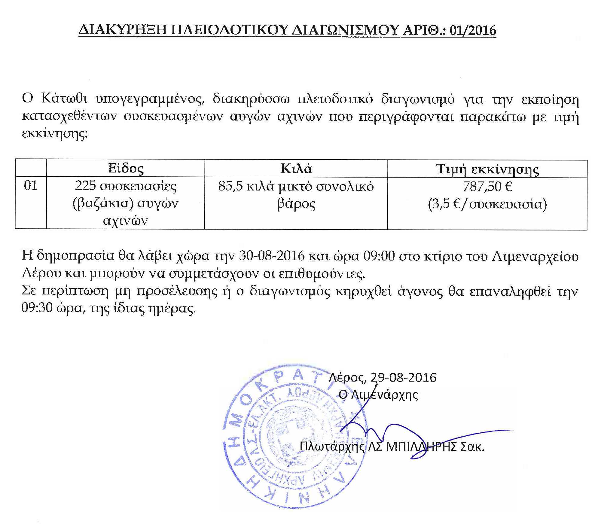 Ακολουθεί διακήρυξη πλειοδοτικού διαγωνισμού κατασχεθέντων αλιευμάτων που πρόκειται να γίνει στο Λιμεναρχείο Λέρου την 30-08-2016