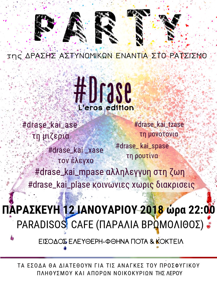 – Παρασκευή 12/1/2017 και από τις 22:00 έως το πρωί διοργάνωση πάρτυ στο καφε-μπαρ Παράδεισος στην παραλία του Βρωμόλιθου, όλα τα έσοδα της οποίας θα διατεθούν για την κάλυψη βασικών αναγκών του προσφυγικού πληθυσμού του ΚΥΤ Λέρου και άπορων νοικοκυριών του νησιού. Καλούμε σε μαζική συμμετοχή στην εκδήλωση τους συναδέλφους μας , τους εργαζόμενους σε δομές για τους πρόσφυγες, τους αλληλέγγυους και τους κατοίκους του νησιού, για να διασκεδάσουν μέχρι πρωίας για καλό σκοπό.