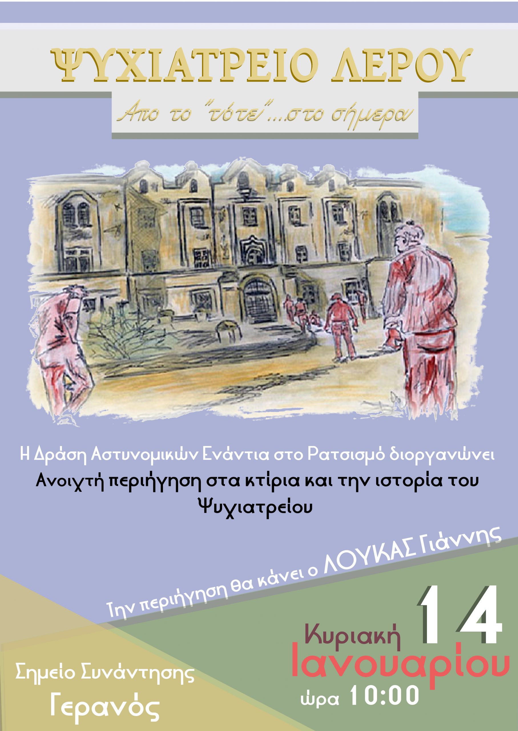 – Κυριακή 14-1-2017 και ώρα 10:00 ανοιχτή ιστορική περιήγηση στα κτίρια του Ψυχιατρείου όπου αρχικά στοιβάχτηκαν τα ανταρτόπαιδα των περίφημων Παιδουπόλεων της Φρειδερίκης, για να «γαλουχηθούν» στα ιδανικά του Πατρίς- Θρησκεία-Οικογένεια και να «αναμορφωθούν», για να ακολουθήσουν οι «χρόνιοι» , «αζήτητοι», και «μη επιδεχόμενοι βελτιώσεως» ψυχοπαθείς για την αποσυμφόρηση των Ψυχιατρείων της ενδοχώρας. Την τετραετία δε 1967-1971 μια σιδηρόφρακτη κατασκευή χώριζε την αποικία Ψυχοπαθών από τους πολιτικούς εξόριστους της χούντας. Σήμερα σε κοντέινερ που στήθηκαν στον ίδιο χώρο φιλοξενούνται χιλιάδες πρόσφυγες και μετανάστες που ξεριζώθηκαν από τον τόπο τους και έρχονται αντιμέτωποι με τα κλειστά σύνορα . Την περιήγηση θα πραγματοποιήσει ο κ. Γιάννης Λουκάς , ψυχίατρος.