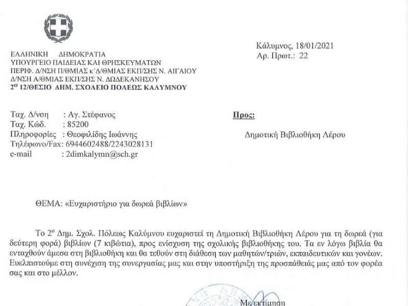Ευχαριστήριο σημείωμα του Διευθυντή του 2ου Δημοτικού Σχολείου Πόλεως Καλύμνου για τη δωρεά βιβλίων προς ενίσχυση της σχολικής τους βιβλιοθήκης.
