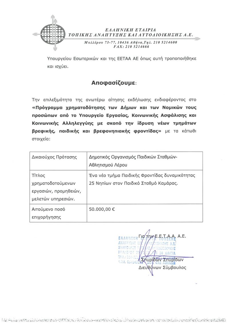 Ο Δήμαρχος Λέρου κ. Μιχάλη Κόλιας, ανακοινώνει με μεγάλη χαρά και ικανοποίηση ότι εγκρίθηκε η χρηματοδότηση από την ΕΕΤΑΑ Α.Ε του Δημοτικού Οργανισμού Παιδικών Σταθμών – Αθλητισμού – Πολιτισμού (ΔΟΠΑΙΣΑΠ), για την κτιριακή αναβάθμιση – επέκταση του Παιδικού Σταθμού Καμάρας.