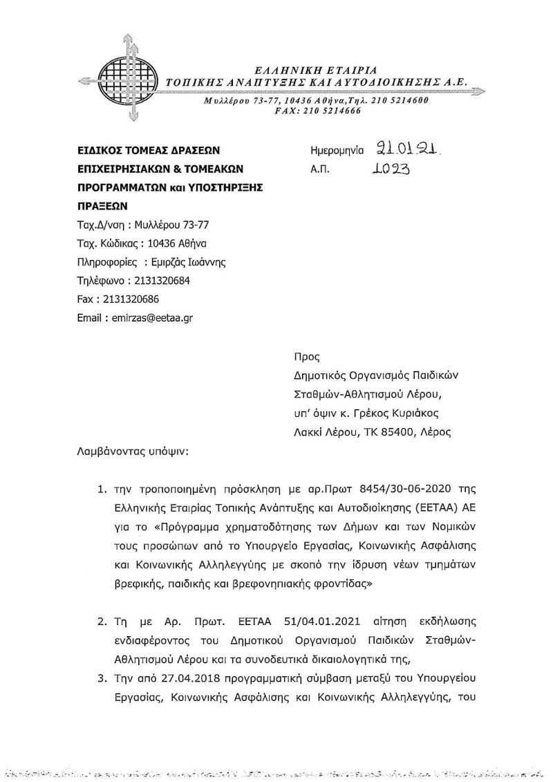 Ο Δήμαρχος Λέρου κ. Μιχάλης Κόλιας εκφράζει τις θερμές του ευχαριστίες στον Διευθύνων Σύμβουλο για την Ε.Ε.Τ.Α.Α. Α.Ε κ. Σπυρίδων Σπυρίδων, στην Πρόεδρο του ΔΟΠΑΙΣΑΠ κα Μαριέττα Κανάρη, στον Αντιδήμαρχο και υπεύθυνο των Παιδικών Σταθμών κ. Άκη Γρεκό καθώς και στο προσωπικό του Δήμου και του ΔΟΠΑΙΣΑΠ για τη σημαντική αυτή εξέλιξη.
