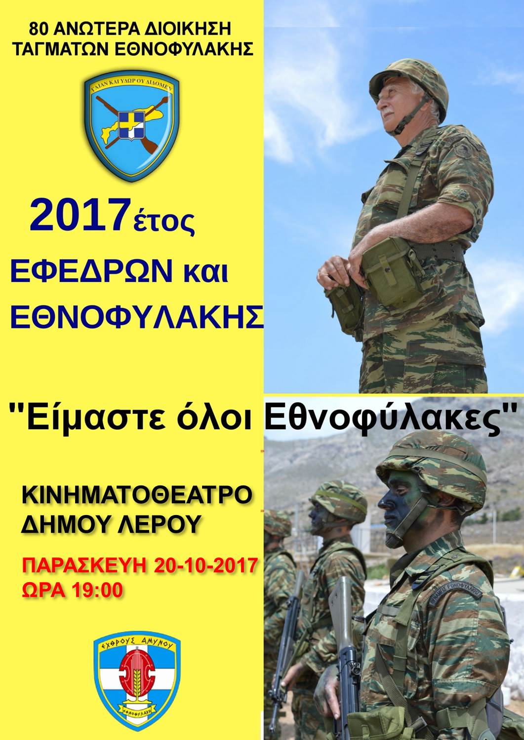 Στο πλαίσιο της απόφασης ανακήρυξης του έτους 2017, ως έτος Εφέδρων και Εθνοφυλάκων από το ΥΠΕΘΑ, ως ελάχιστη έμπρακτη επιβράβευση της ουσιαστικής και διαχρονικής συμβολής των θεσμών στην άμυνα της Χώρας, θα διεξαχθεί ομιλία, την Παρασκευή 20 Οκτωβρίου 2017 και ώρα 7μμ, στο Κινηματοθέατρο του Δήμου Λέρου, από τη Διοίκηση του Τάγματος Εθνοφυλακής Πάτμου, για τους θεσμούς της Εφεδρείας και Εθνοφυλακής.